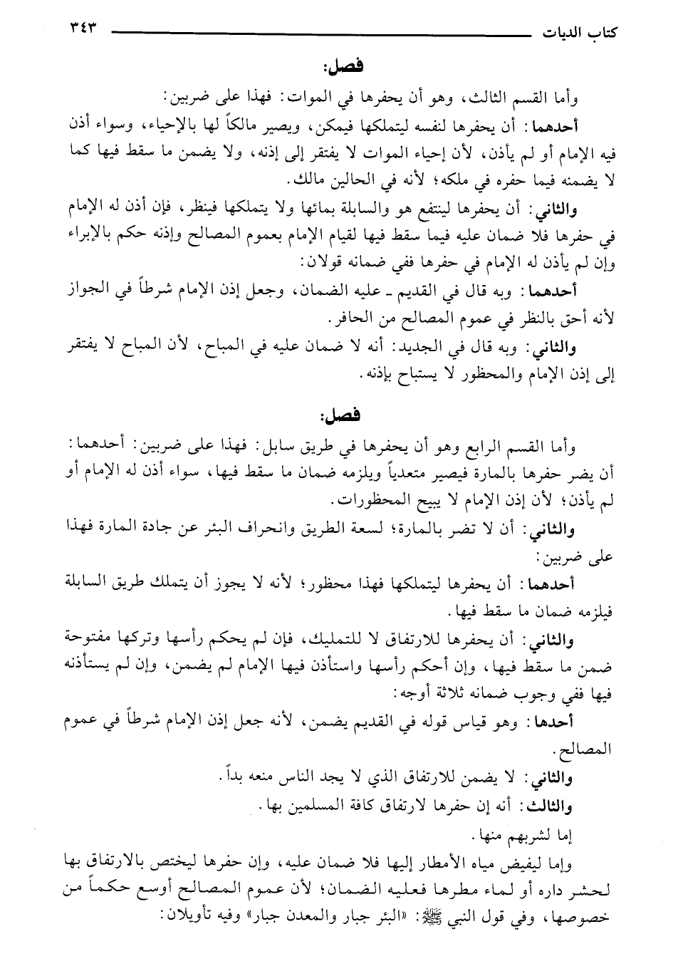 والثاني: أن يحفرها لينتفع هو والسابلة بمائها ولا يتملكها فينظر، فإن أذن له الإمام في حفرها فلا ضمان عليه فيما سقط فيها لقيام الإمام بعموم المصالح وإذنه حكم بالإبراء وإن لم يأذن له الإمام في حفرها ففي ضمانه قولان: