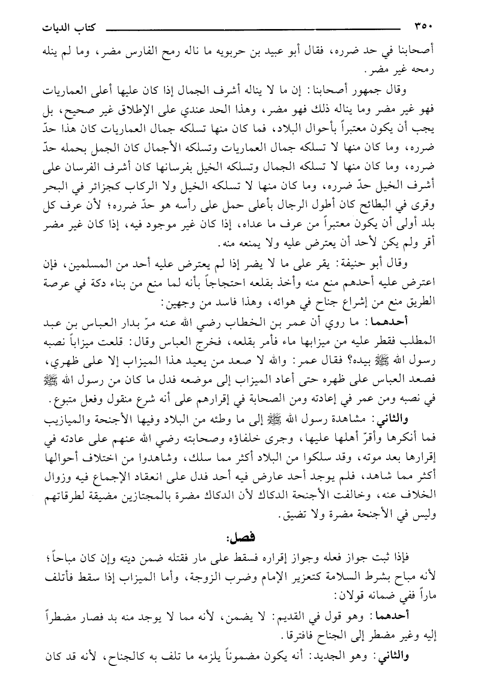 وقال جمهور أصحابنا: إن ما لا يناله أشرف الجمال إذا كان عليها أعلى العماريات فهو غير مضر وما يناله ذلك فهو مضر، وهذا الحد عندي على الإطلاق غير صحيح، بل يجب أن يكون معتبرًا بأحوال البلاد، فما كان منها تسلكه جمال العماريات كان هذا حد ضرره، وما كان منها لا تسلكه جمال العماريات وتسلكه الأجمال كان الجمل بحمله حد ضرره، وما كان منها لا تسلكه الجمال وتسلكه الخيل بفرسانها كان أشرف الفرسان على أشرف الخيل حد ضرره، وما كان منها لا تسلكه الخيل ولا الركاب كجزائر في البحر وقرى في البطائح كان أطول الرجال بأعلى حمل على رأسه هو حد ضرره؛ لأن عرف كل بلد أولى أن يكون معتبرًا من عرف ما عداه، إذا كان غير موجود فيه، إذا كان غير مضر أقر ولم يكن لأحد أن يعترض عليه ولا يمنعه منه.