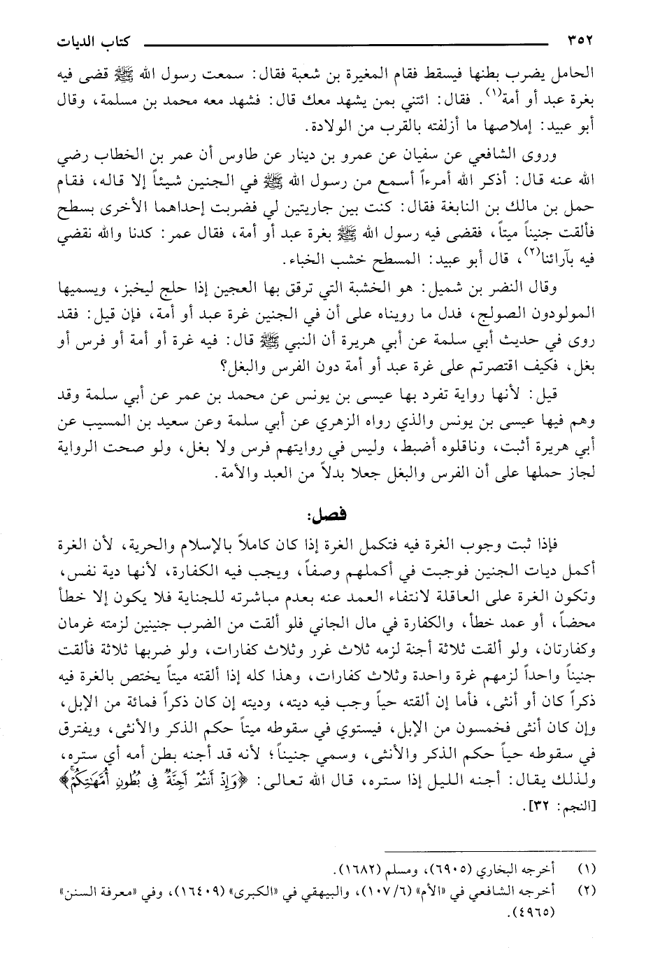 فإذا ثبت وجوب الغرة فيه فتكمل الغرة إذا كان كاملًا بالإسلام والحرية، لأن الغرة أكمل ديات الجنين فوجبت في أكملهم وصفًا، ويجب فيه الكفارة، لأنها دية نفس، وتكون الغرة على العاقلة لانتفاء العمد عنه بعدم مباشرته للجناية فلا يكون إلا خطأ محضًا، أو عمد خطأ، والكفارة في مال الجاني فلو ألقت من الضرب جنينين لزمته غرمان وكفارتان، ولو ألقت ثلاثة أجنة لزمه ثلاث غرر وثلاث كفارات، ولو ضربها ثلاثة فألقت جنينًا واحدًا لزمهم غرة واحدة وثلاث كفارات، وهذا كله إذا ألقته ميتًا يختص بالغرة فيه ذكرًا كان أو أنثى، فأما إن ألقته حيًا وجب فيه ديته، وديته إن كان ذكرًا فمائة من الإبل، وإن كان أنثى فخمسون من الإبل، فيستوي في سقوطه ميتًا حكم الذكر والأنثى، ويفترق في سقوطه حيًا حكم الذكر والأنثى، وسمي جنينًا؛ لأنه قد أجنه بطن أمه أي ستره، ولذلك يقال: أجنه الليل إذا ستره، قال الله تعالى: {الأَرْضِ وَإِذْ أَنتُمْ أَجِنَّةٌ فِي بُطُونِ أُمَّهَاتِكُمْ} [النجم:32].