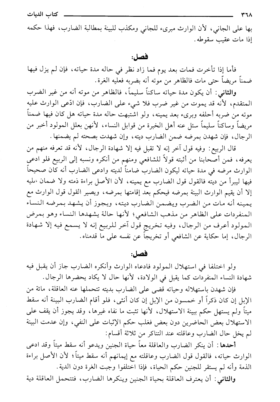 فإن شهدن باستهلاله وحياته قضى على الضارب بديته تتحملها عنه العاقلة، مائة من الإبل إن كان ذكراً أو خمسون من اقبل إن كان أنثى، فلو أقام الضارب البينة أنه سقط ميتاً ولم يستهل حكم ببينة الاستهلال، لأنها تثبت ما نفاه غيرها، وقد يجوز أن يقف على الاستهلال بعض الحاضرين دون بعض فغلب حكم الإثبات على النفي، وإن عدمت البينة لم يخل حال الضارب وعاقلته عند التناكر من ثلاثة أقسام: