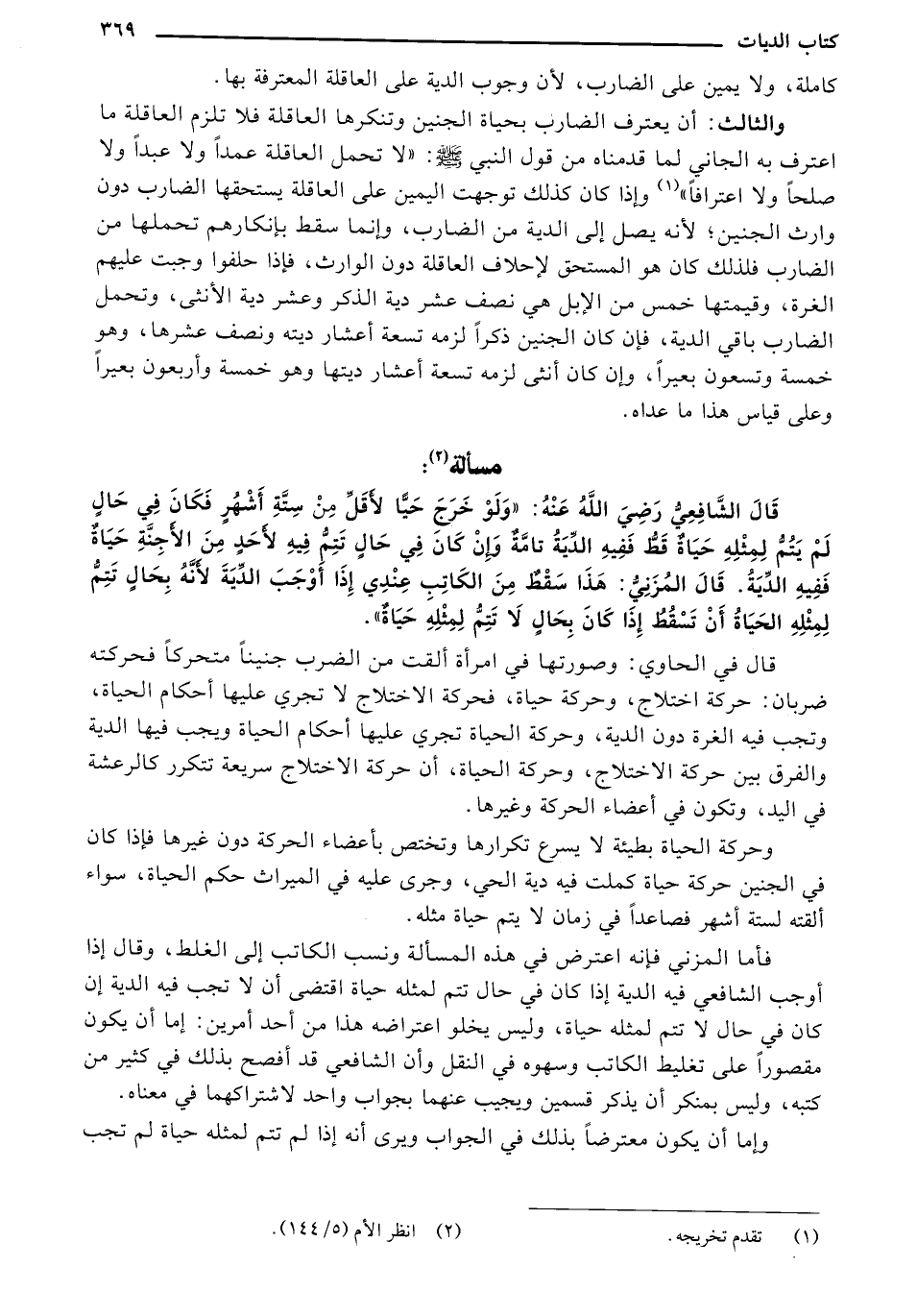 قال الشافعي رضي الله عنه: "ولو خرج حياً لأقل من ستة أشهر فكان في حال لم يتم لمثله حياة قط ففيه الدية تامة وإن كان في حال تتم فيه لأحد من الأجنة حياة ففيه الدية. قال المزني: هذا سقط من الكاتب عندي إذا أوجب الدية لأنه بحال تتم لمثله الحياة أن تسقط إذا كان بحال لا تتم لمثله حياة ".
