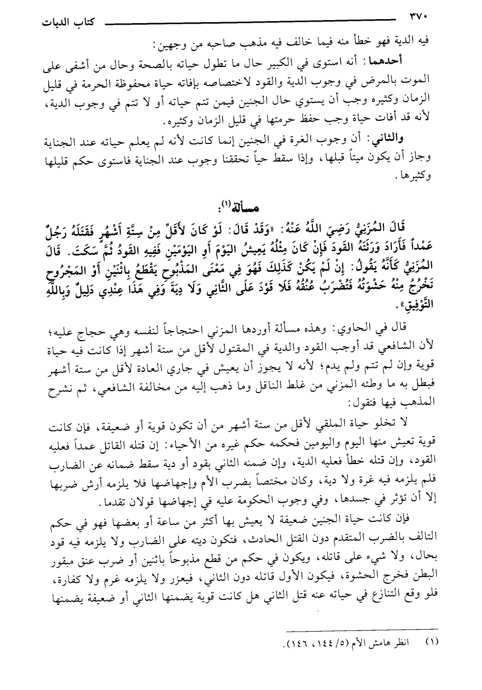 قال المزني رضي الله عنه: "وقد قال: لو كان لأقل من ستة أشهر فقتله رجل عمداً فأراد ورثته القود فإن كان مثله يعيش اليوم أو اليومين ففيه القود ثم سكت. قال المزني كأنه يقول: إن لم يكن كذلك فهو في معنى المذبوح يقطع باثنين أو المجروح تخرج منه حشوته فتضرب عنقه فلا قود على الثاني ولا دية وفي هذا عندي دليل وبالله التوفيق ".