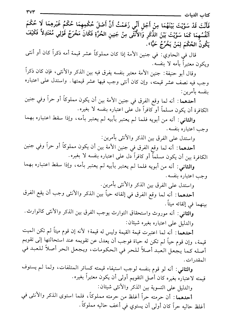 فأنت قد سويت بينهما من أجل أني زعمت أن أصل حكمهما حكم غيرهما لا حكم أنفسهما كما سويت بين الذكر والأنثى من جنين الحرة فكان مخرج قولي معتدلًا فكيف يكون الحكم لمن يخرج حيًا".