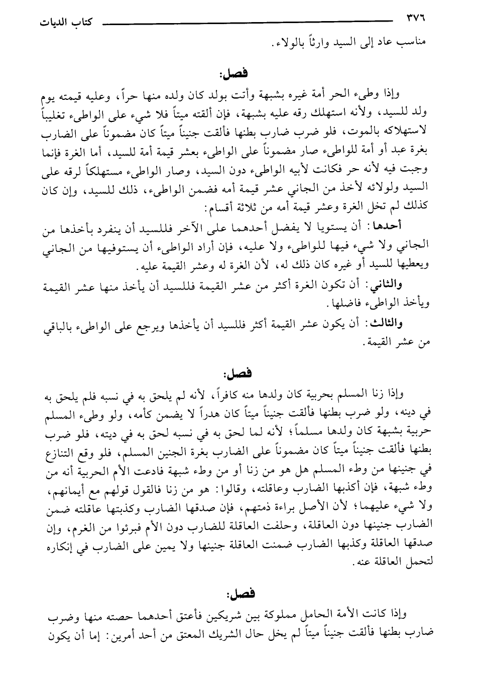 وإذا وطئ الحر أمة غيره بشبهة وأتت بولد كان ولده منها حرًا، وعليه قيمته يوم ولد للسيد، ولأنه استهلك رقه عليه بشبهة، فإن ألقته ميتًا فلا شيء على الواطئ تغليبًا لاستهلاكه بالموت، فلو ضرب ضارب بطنها فألقت جنينًا ميتًا كان مضمونًا على الضارب بغرة عبد أو أمة للواطئ صار مضمونًا على الواطئ بعشر قيمة أمة للسيد، أما الغرة فإنما وجبت فيه لأنه حر فكانت لأبيه الواطئ دون السيد، وصار الواطئ مستهلكًا لرقه على السيد ولولائه لأخذ من الجاني عشر قيمة أمه فضمن الواطئ، ذلك للسيد، وإن كان كذلك لم تخل الغرة وعشر قيمة أمه من ثلاثة أقسام: