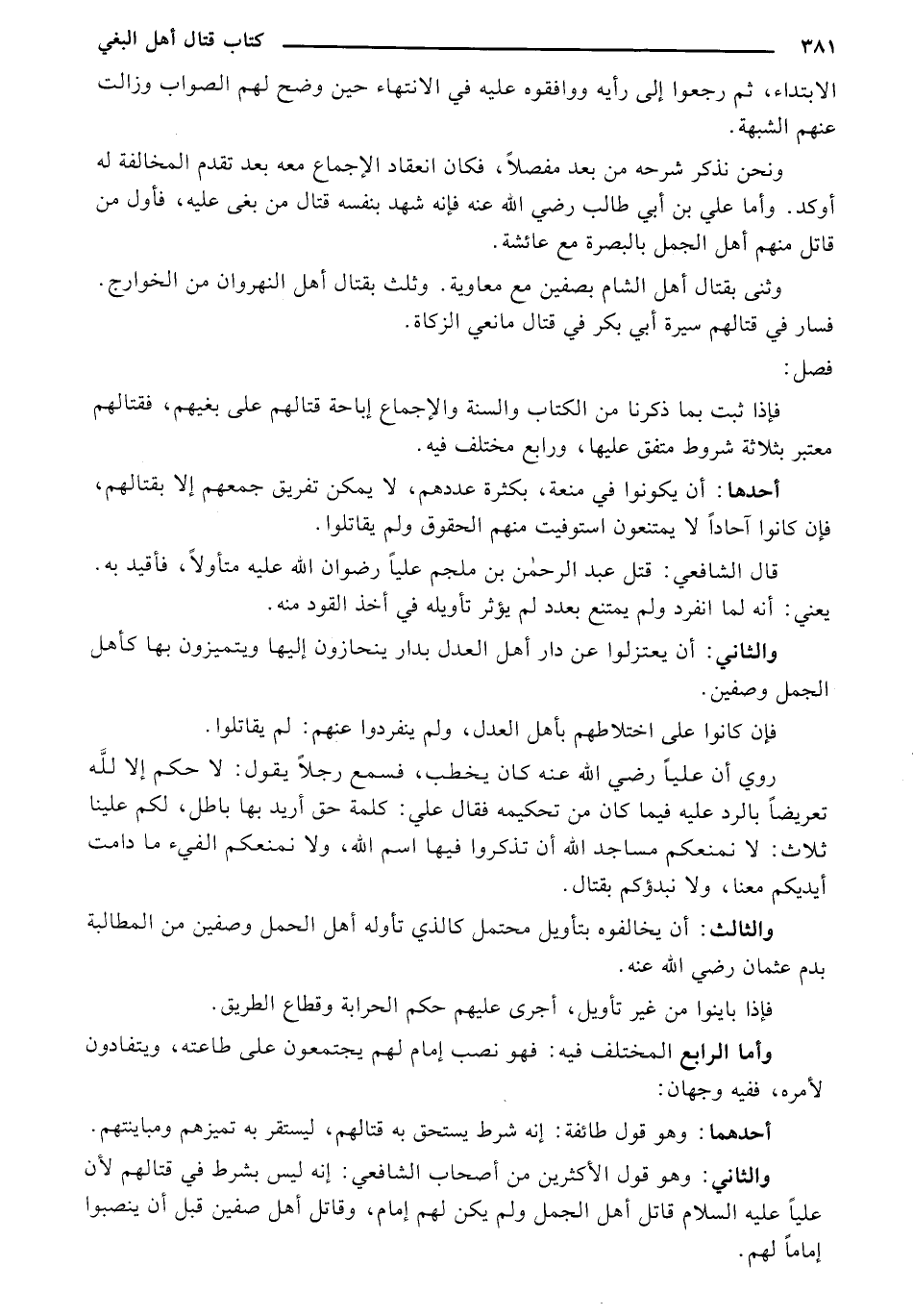 ونحن نذكر شرحه من بعد مفصلًا، فكان انعقاد الإجماع معه بعد تقدم المخالفة له أوكد. وأما علي بن أبي طالب رضي الله عنه فإنه شهد بنفسه قتال من بغى عليه، فأول من قاتل منهم أهل الجمل بالبصرة مع عائشة.