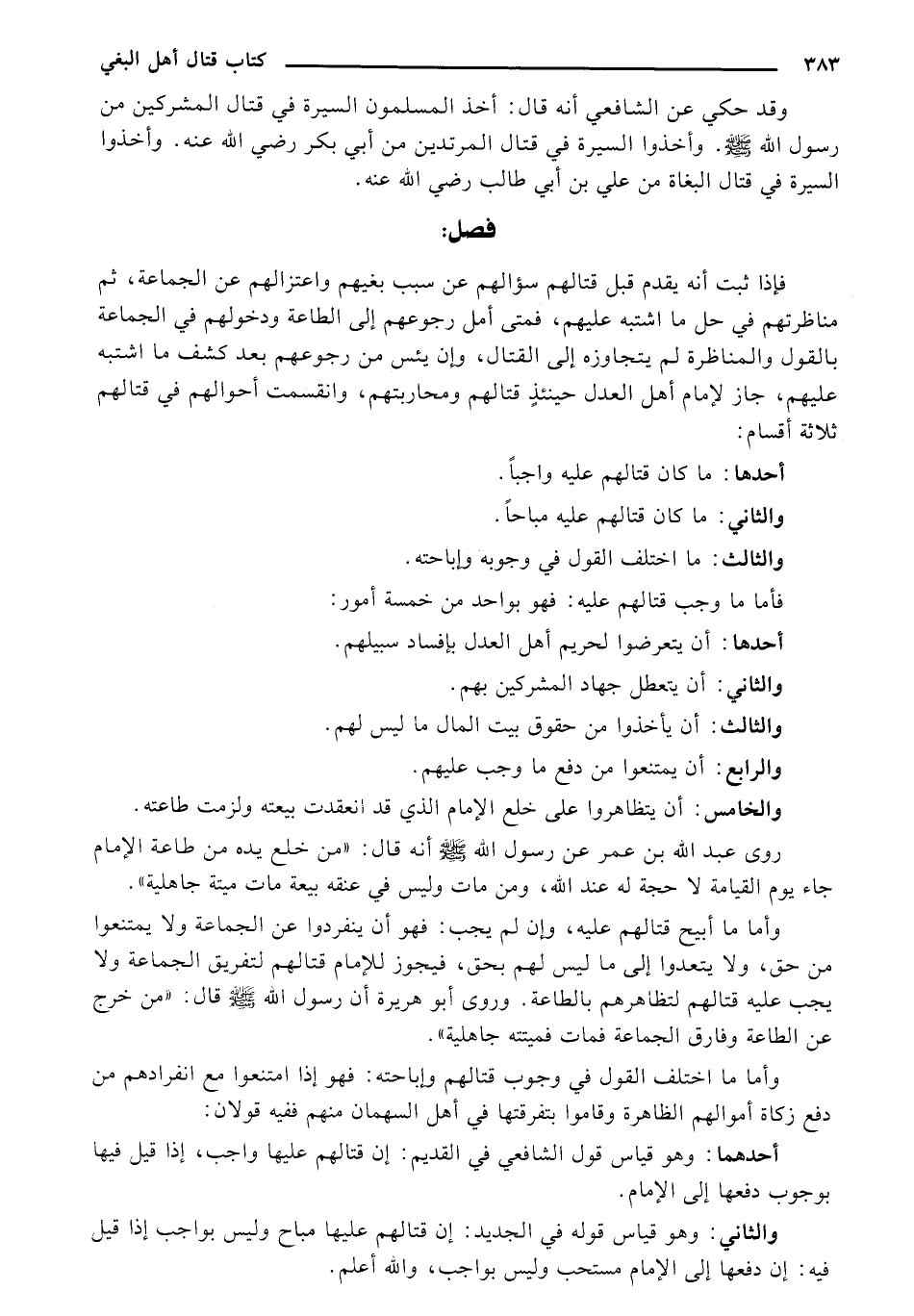 وقد حكي عن الشافعي أن قال: أخذ المسمون السيرة في قتال المشركين من رسول الله صلى الله عليه وسلم. وأخذوا السيرة في قتال المرتدين من أبي بكر رضي الله عنه. وأخذوا السيرة في قتال البغاة من علي بن أبي طالب رضي الله عنه.