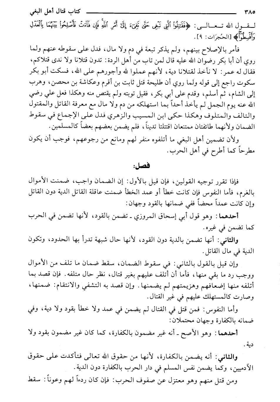فأمر بالإصلاح بينهم، ولم يذكر تبعة في دم ولا مال، فدل على سقوطه عنهم ولما روي أن أبا بكر رضوان الله عليه قاله لم تاب من أهل الردة: تدون قتلانا ولا ندي قتلاكم، فقال له عمر: لا نأخذ لقتلانا دية، لأنهم عملوا لله وأجورهم على الله، فسكت أبو بكر سكوت راجع إلى قوله ولما روي أن طليحة قتل ثابت بن أقرم وعكاشة بن محصن، وهرب إلى الشام، ثم أسلم، وقدم على أبي بكر، فقبل توبته ولم يقتص منه وهكذا فعل علي رضي الله عنه يوم الجمل لم يأخذ أحدًا بما استهلكه من دم ولا مال مع معرفة القاتل والمقتول والتالف والمتلوف وهكذا حكي ابن المسيب والزهري فدل على الإجماع في سقوط الضمان ولأنهما طائفتان ممتنعان اقتتلتا تدينًا، فلم يضمن بعضهم بعضًا كالمسلمين.