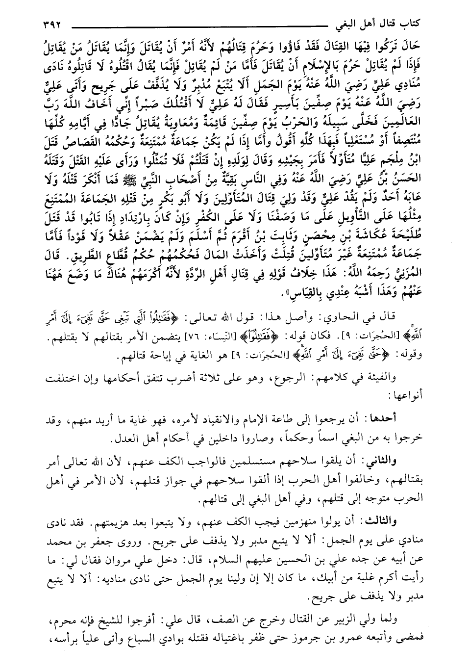والثالث: أن يولوا منهزمين فيجب الكف عنهم، ولا يتبعوا بعد هزيمتهم (0) فقد نادي منادى على يوم الجمل: ألا لا يتبع مدبر ولا يذفف على جريح. وروى جعفر بن محمد عن أبيه عن جده علي بن الحسين عليهم السلام، قال: دخل علي مروان فقال لي: ما رأيت أكرم غلبة من أبيك، ما كان إلا إن ولينا يوم الجمل حتى نادى مناديهن: ألا لا يتبع مدبر ولا يذفف على جريح.