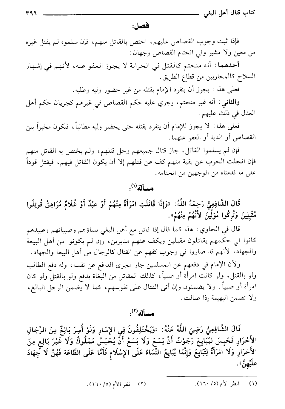 قال في الحاوي: هذا كما قال إذا قاتل مع أهل البغي نساؤهم وصبيانهم وعبيدهم كانوا في حكمهم يقاتلون مقبلين ويكف عنهم مدبرين، وإن لم يكونوا من أهل البيعة والجهاد، لأنهم قد صاروا في وجوب كفهم عن القتال كالرجال من أهل البيعة والجهاد.
