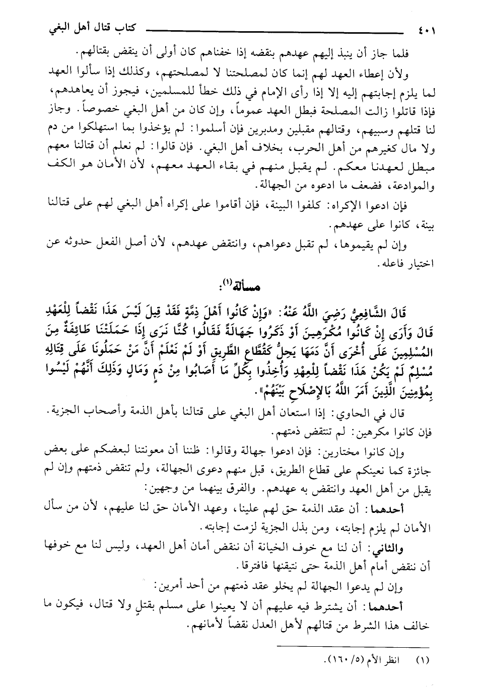 قال الشافعي رضي الله عنه: "وإن كانوا أهل ذمة فقد قيل ليس هذا نقضاً للعهد قال ورأى كانوا مكرهين أو ذكروا جهالة فقالوا كنا نرى إذا حملتنا طائفة من المسلمين على أخرى أن دمها يحل كقطاع الطريق أو لم نعلم أن من حملونا على قتاله مسلم لم يكن هذا نقضاً للعهد وأخذوا بكل ما أصابوا من دم ومال وذلك أنهم ليسوا بمؤمنين الذين أمر الله بالإصلاح بينهم.