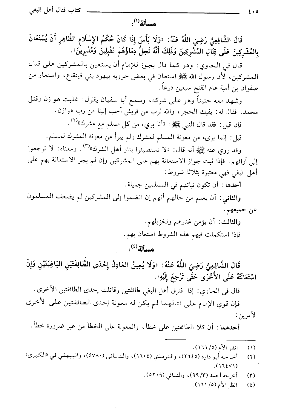 قال الشافعي رضي الله عنه: " ولا يعين العادل إحدى طائفتين الباغيتين وإن استعانته على الأخرى حتى نرجع إليه".