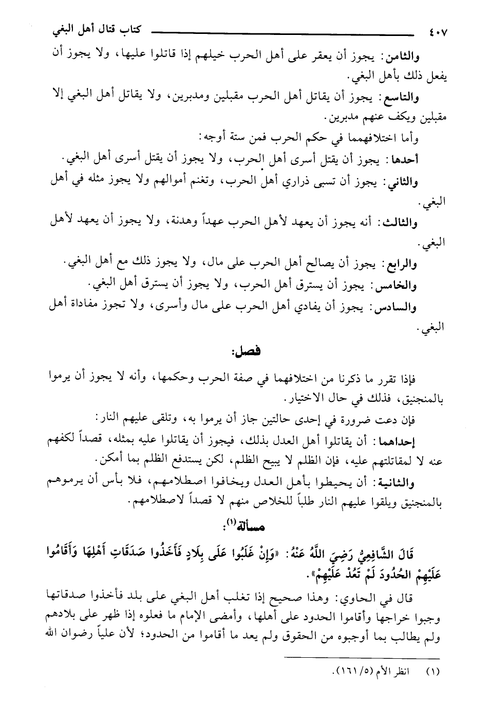 والتاسع: يجوز أن يقاتل أمل الحرب مقبلين ومدبرين، ولا يقاتل أهل البغي إلا مقبلين ويكف عنهم مدبرين.