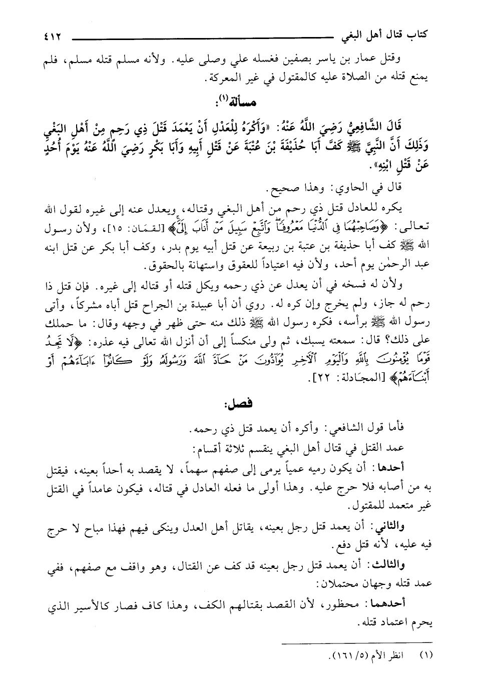 قال الشافعي رضي الله: "وأكره للعدل أن يعمد قتل ذي رحم من أهل البغي وذلك أن النبي صلى الله عليه وسلم كف أبا حذيفة بن عتبة عن قتل أبيه وأبا بكر رضي الله عنه يوم أحد عن قتل ابنه".