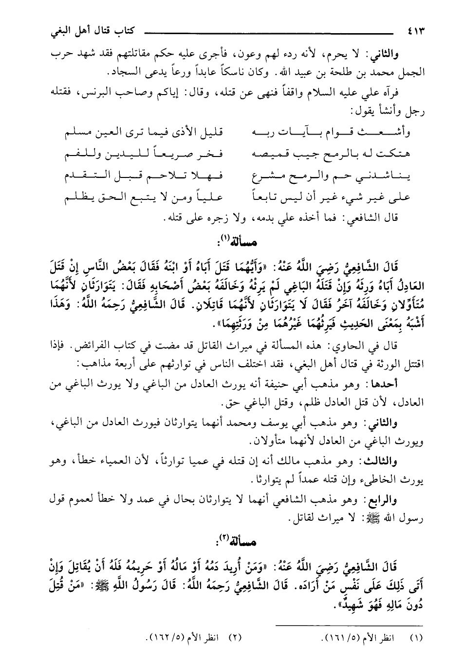 قال الشافعي رضي الله عنه: "وأيهما قتل أباه أو ابنه فقال بعض الناس إن قتل العادل أباه ورثه وإن قتله الباغي لم يرثه وخالفه بعض أصحابه فقال: يتوارثان لأنهما متأولان وخالفه آخر فقال لا يتوارثان لأنهما قاتلان. قال الشافعي رحمه الله: وهذا أشبه بمعنى الحديث فيرثهما غيرهما من ورثتهما".