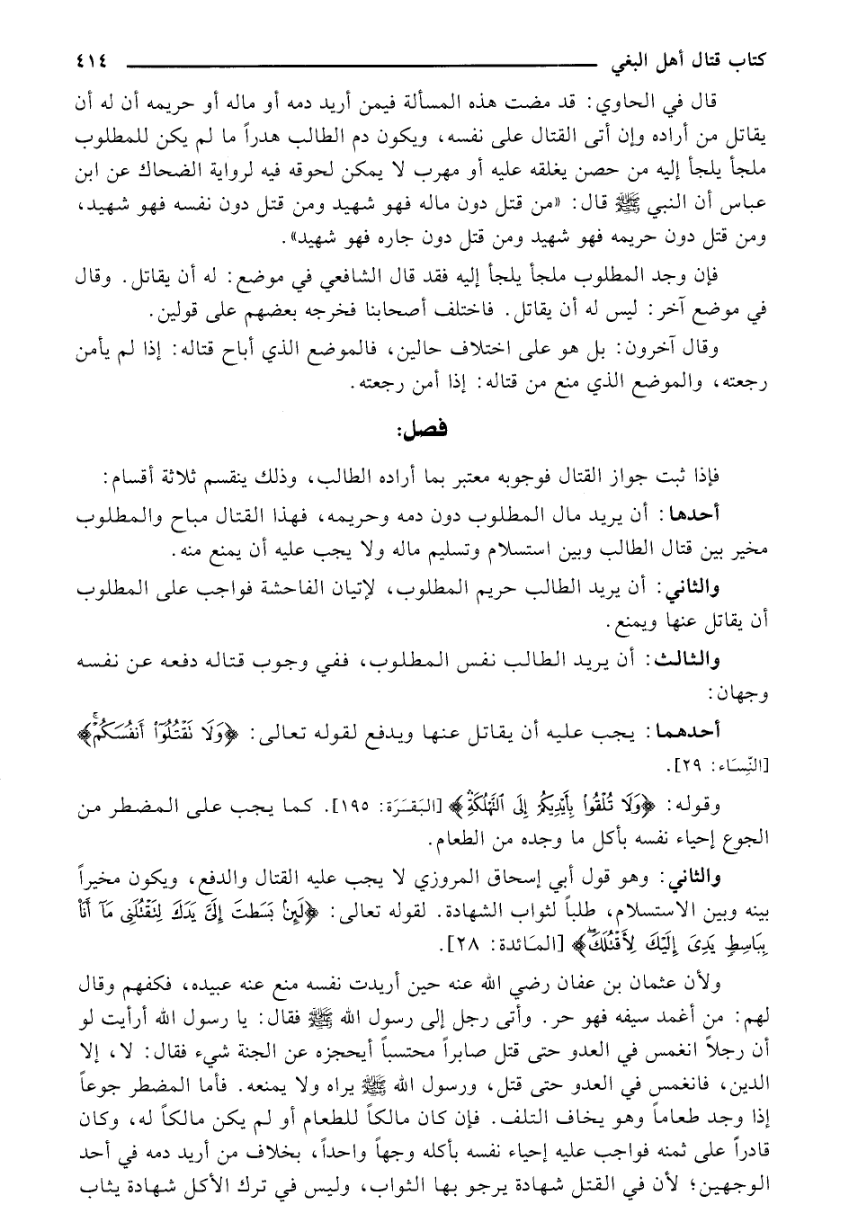 قال في الحاوي: قد مضت هذه المسألة فيمن أريد دمه أو ماله أو حريمه أن له أن يقاتل من أراده وإن أتى القتال على نفسه, ويكون دم الطالب هدرًا ما لم يكن للمطلوب ملجأ يلجأ إليه من حصن يغلقه عليه أو مهرب لا يمكن لحوقه فيه لرواية الضحاك عن ابن عباس أن النبي صلى الله عليه وسلم قال: "من قتل دون ماله فهو شهيد ومن قتل دون نفسه فهو شهيد, ومن قتل دون حريمه فهو شهيد ومن قتل دون جاره فهو شهيد".