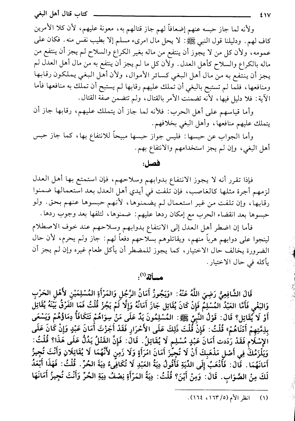 ولأنه لما جاز حبسه عنهم إضعافًا لهم جاز قتالهم به, معونة عليهم, لأن كلا الأمرين كاف لهم. ودليلنا قول النبي صلى الله عليه وسلم: لا يحل مال امرؤء مسلم إلا بطيب نفس منه. فكان على عمومه, ولأن كل من لا يجوز أن ينتفع من ماله بغير الكراع والسلاح كأهل العدل. ولأن كل ما لم يجز أن ينتفع به من مال أهل البغي كسائر الأموال, ولأن أهل البغي يملكون رقابها ومنافعها, فلما لم تستبح بالبغي أن تملك عليهم رقابها لم يستبح أن تملك به منافعها فأما الآية: فلا دليل فيها, لأنه تضمنت الأمر بالقتال, ولم تتضمن صفة القتال.