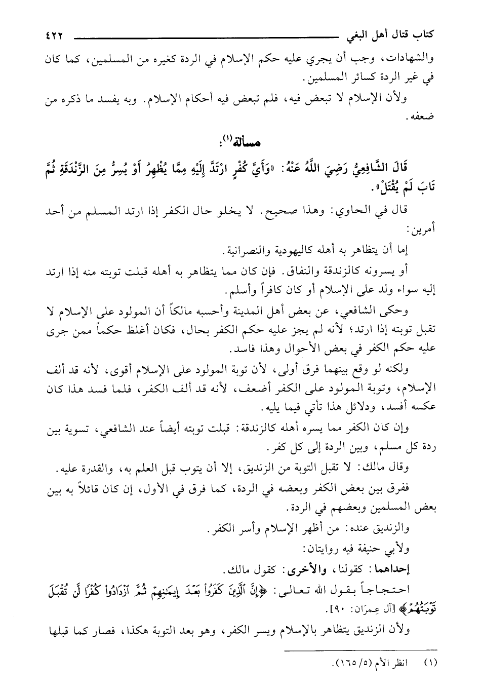 قال الشافعي رضي الله عنه: "وأي كفر ارتد إليه مما يظهر أو يسر من الزندقة ثم تاب لم يقتل".