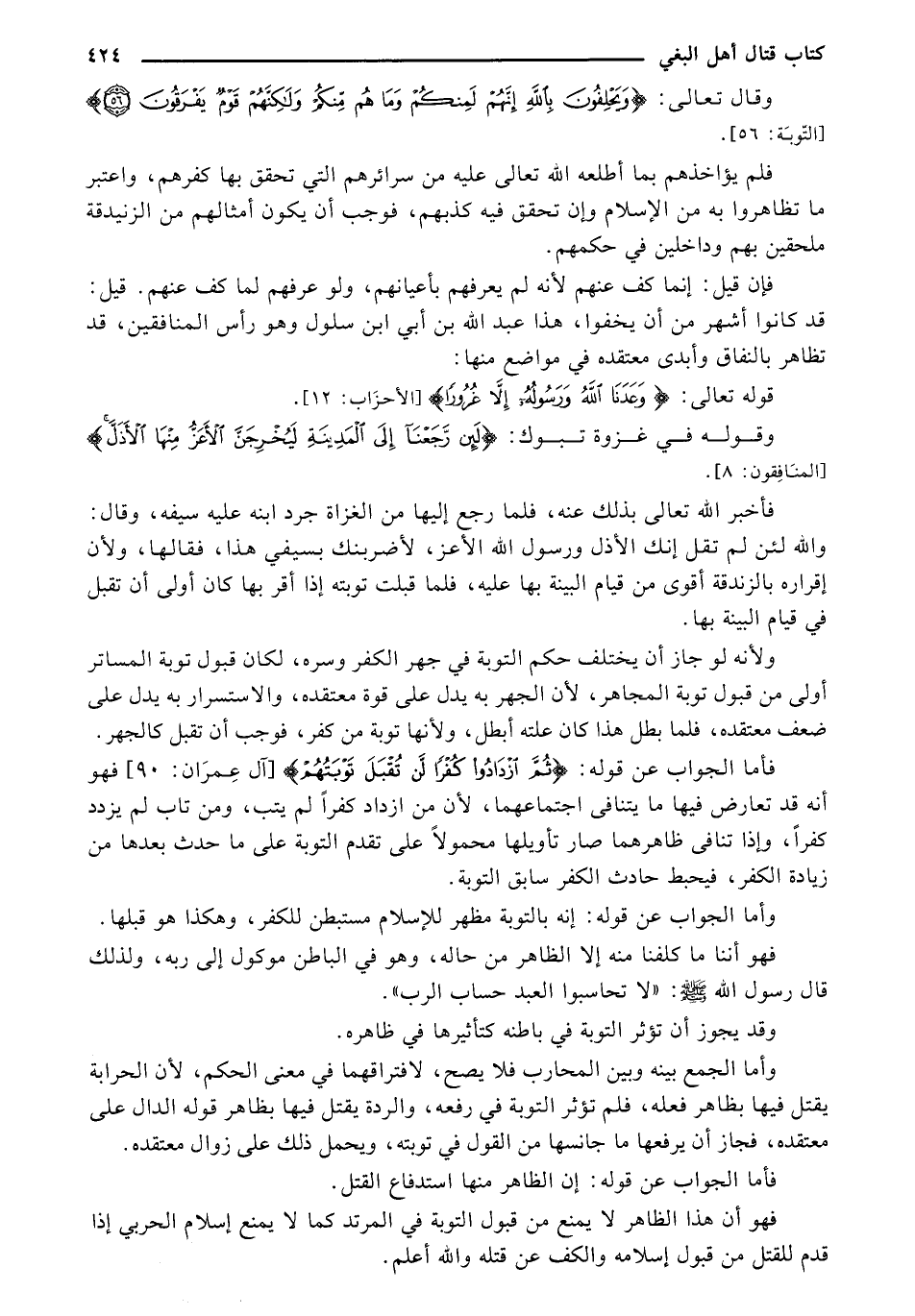 فأخبر الله تعالى بذلك عنه, فلما رجع إليها من الغزاة جرد ابنه عليه سيفه, وقال والله لئن لم تقل إنك الأذل ورسول الله الأعز, لأضربنك بسيفي هذا, فقالها, ولأن إقراره بالزندقة أقوى من قيام البينة بها عليه, فلما قبلت توبته إذا أقر بها كان أولى أن تقبل في قيام البينة بها.