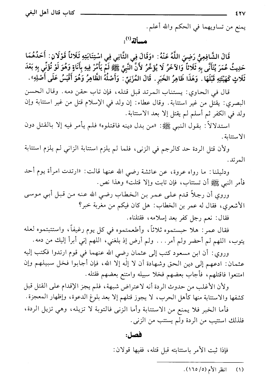 قال الشافعي رضي الله عنه: "وقال في الثاني في استتابته ثلاثًا قولان: أحدهما حديث عمر يتأنى به ثلاثًا والآخر لا يؤخر لأن النبي صلى الله عليه وسلم لم يأمر فيه بأناة وهو لو تؤني به بعد ثلاث كهيئته قبلها. وهذا ظاهر الخبر. قال لامزني: وأصله الظاهر وهو أقيس على أصله".