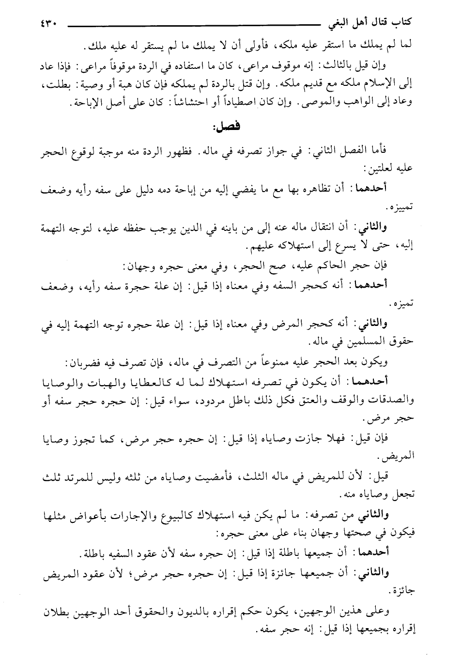 فأما الفصل الثاني: في جواز تصرف في ماله. فظهور الردة منه موجبة لوقوع الحجر عليه لعتلين: