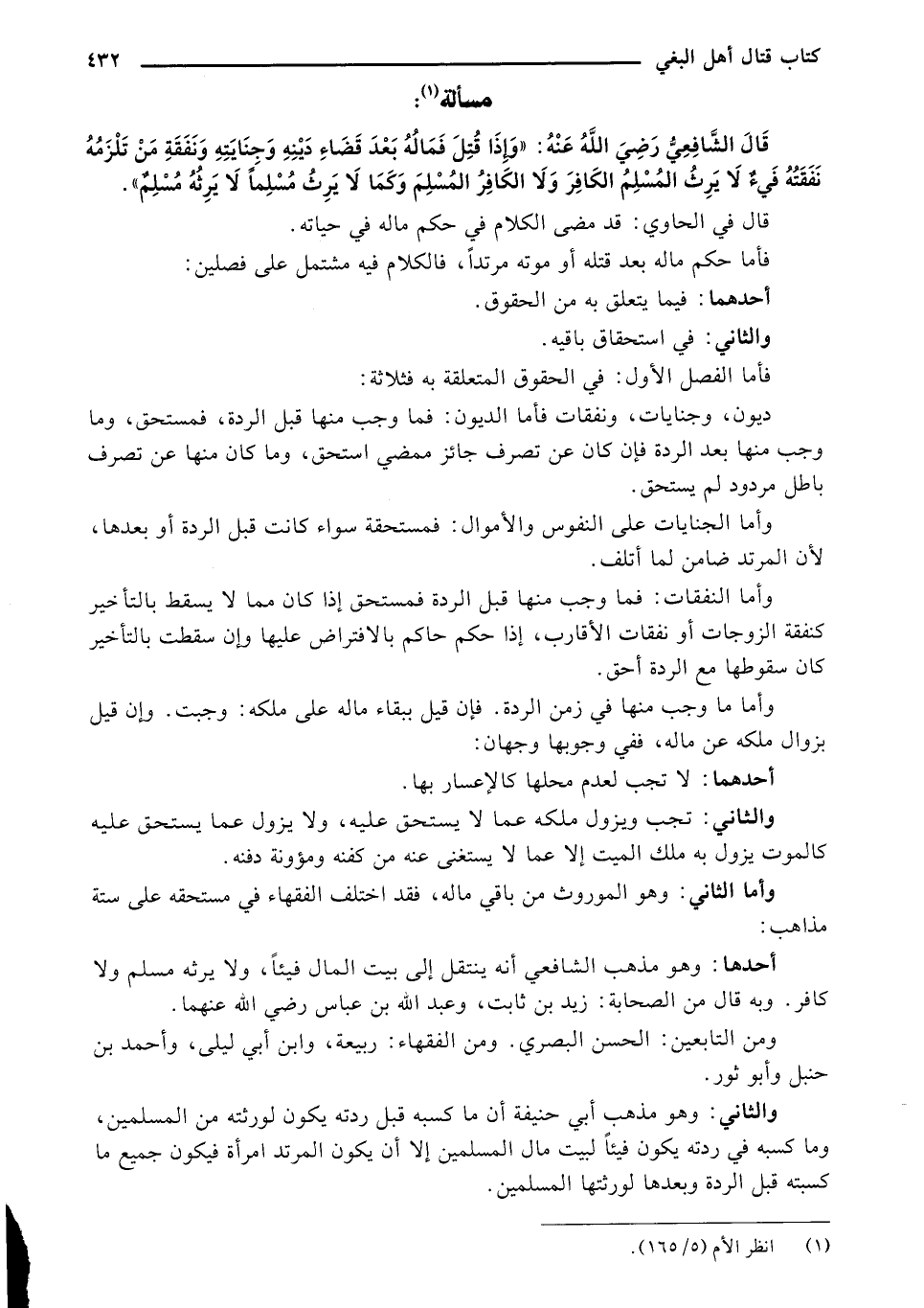 قال الشافعي رضي الله عنه: "وإن قتل فماله بعد قضاء دينه وجنايته ونفقة من تلزمه نفقته فيء لا يرث المسلم الكافر ولا الكافر المسلم وكما لا يرث مسلمًا لا يرثه مسلم".