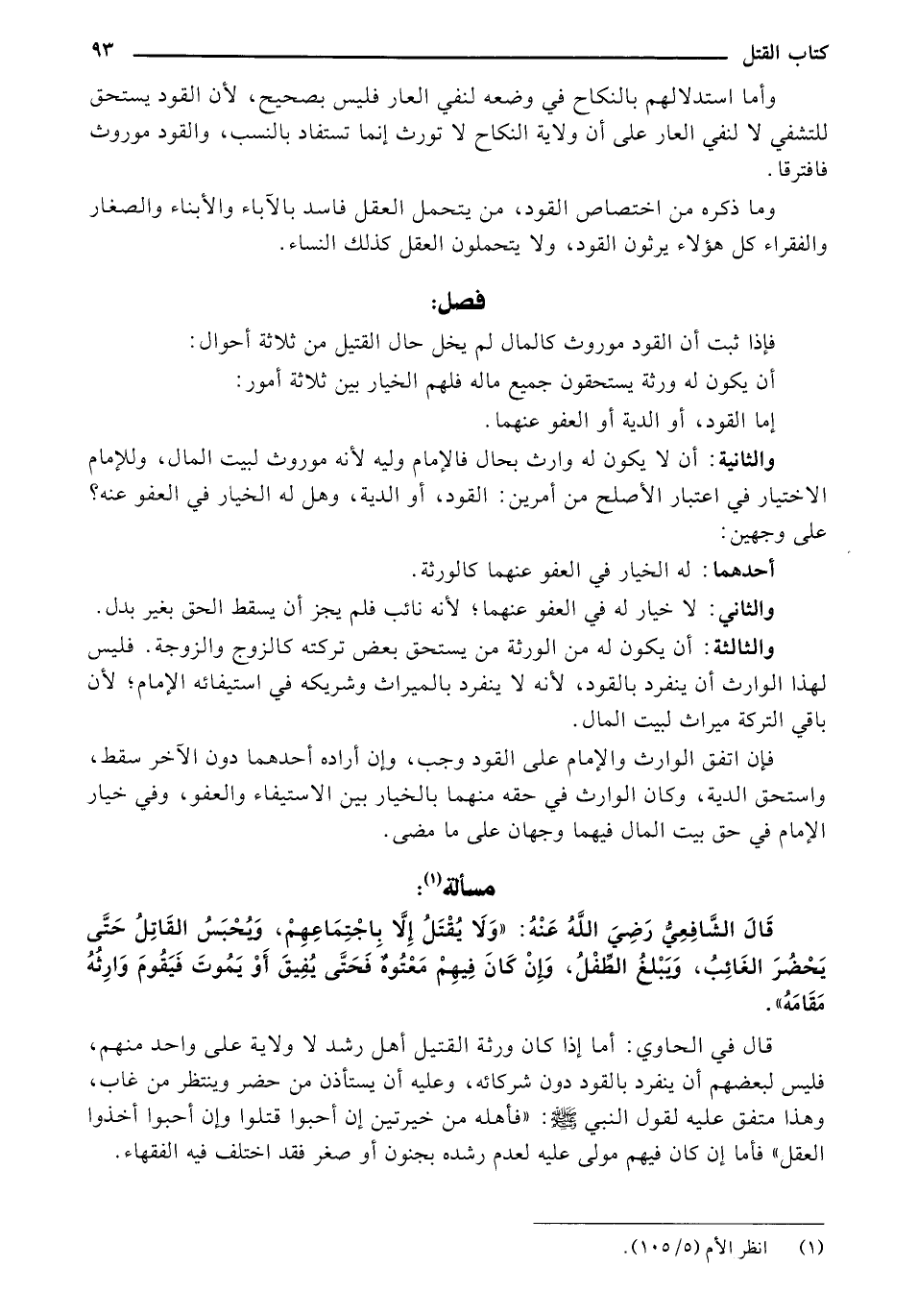 قال الشافعي رضي الله عنه: "ولا يقتل إلا باجتماعهم، ويحبس القاتل حتى يحضر الغائب، ويبلغ الطفل، وإن كان فيهم معتوهٌ فحتى يُفيق أو يموت فيقوم وارثه مقامه".