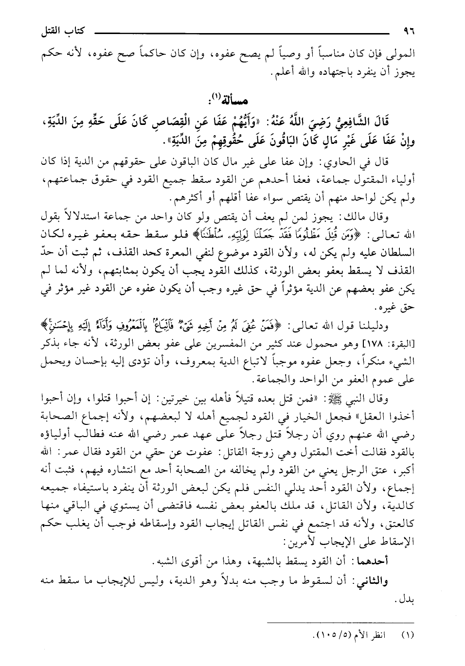 ودليلنا قول الله تعالى: {فَمَنْ عُفِيَ لَهُ مِنْ أَخِيهِ شَيْءٌ فَاتِّبَاعٌ بِالْمَعْرُوفِ وأَدَاءٌ إلَيْهِ بِإحْسَانٍ} [البقرة: 178] وهو محمول عند كثير من المفسرين على عفو بعض الورثة، لأنه جاء بذكر الشيء منكرًا، وجعل عفوه موجبًا لإتباع الدية بمعروف، وأن تؤدى إليه بإحسان ويحمل على عموم العفو من الواحد والجماعة.