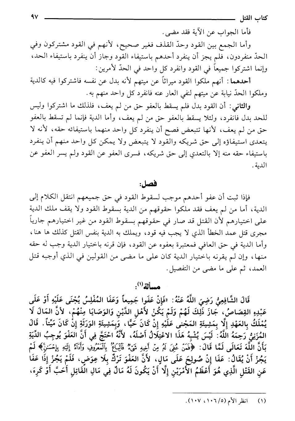 قال الشافعي رضي الله عنه: "فإن عفوا جميعًا وعفا المفلس يُجني عليه أو على عبده القصاص، جاز ذلك لهم ولم يكن لأهل الدين والوصايا منهم، لأن المال لا يُملك بالعهد إلا بمشيئة المجني عليه إن كان حيًا، وبمشيئة الورثة إن كان ميتًا. قال المزني رحمه الله: ليس يُشبه هذا الاعتلال أصله، لأنه احتج في أن العفو يُوجب الدية بأن الله تعالى لما قال: {فَمَنْ عُفِيَ لَهُ مِنْ أَخِيهِ شَيْءٌ فَاتِّبَاعٌ بِالْمَعْرُوفِ وأَدَاءٌ إلَيْهِ بِإحْسَانٍ} لم يجز أن يقال: عفا إن صولح على مالٍ، لأن العفو تركٌ بلا عوضٍ، فلم يجز إذا عفا عن القتل الذي هو أعظم الأمرين إلا أن يكون له مالٌ في مال القاتل أحب أو كره،