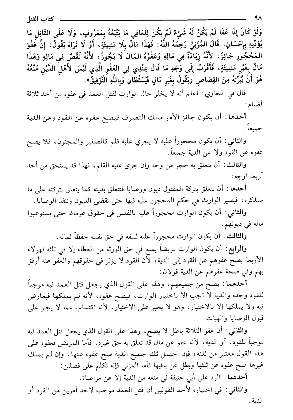 ولو كان إذا عفا لم يكن له شيءٌ لم يكن للعافي ما يتبعه بمعروفٍ، ولا على القاتل ما يُؤديه بإحسانٍ. قال المزني رحمه الله: فهذا مالٌ مشيئةٍ، أو لا تراه يقول: إن عفو المحجور جائزٌ، لأنه زيادةٌ في ماله وعفوه المال لا يجوز، لأنه نقصٌ في ماله وهذا مالٌ بغير مشيئةٍ، فأقرب إلى وجه ما قال عندي في العفو الذي ليس لأهل الدين منعه هو أن يبرئه من القصاص ويقول بغير مالٍ فيسقطان وبالله التوفيق".