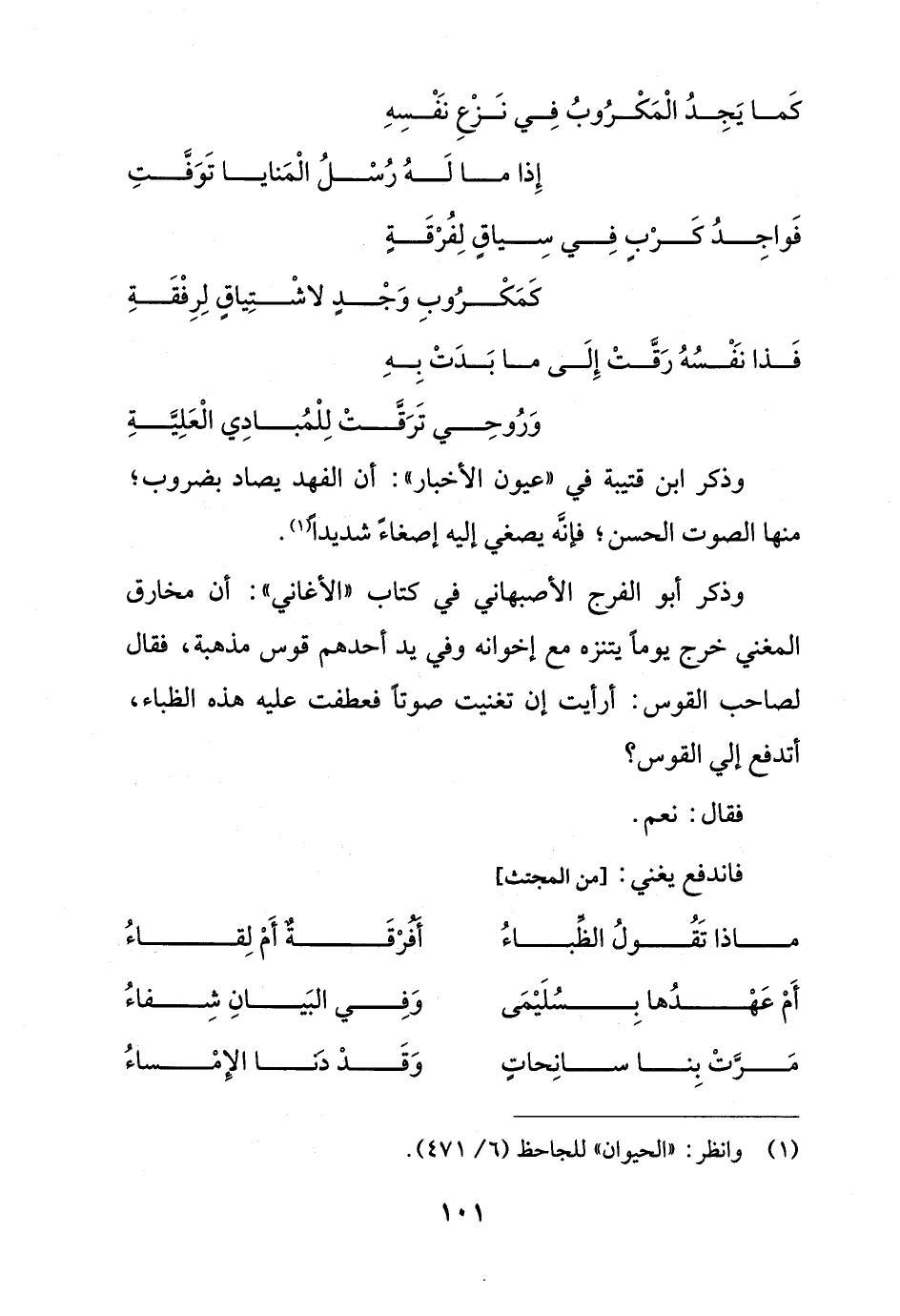 وذكر ابن قتيبة في "عيون الأخبار": أن الفهد يصاد بضروب؛ منها الصوت الحسن؛ فإنَّه يصغي إليه إصغاءً شديداً (¬1).