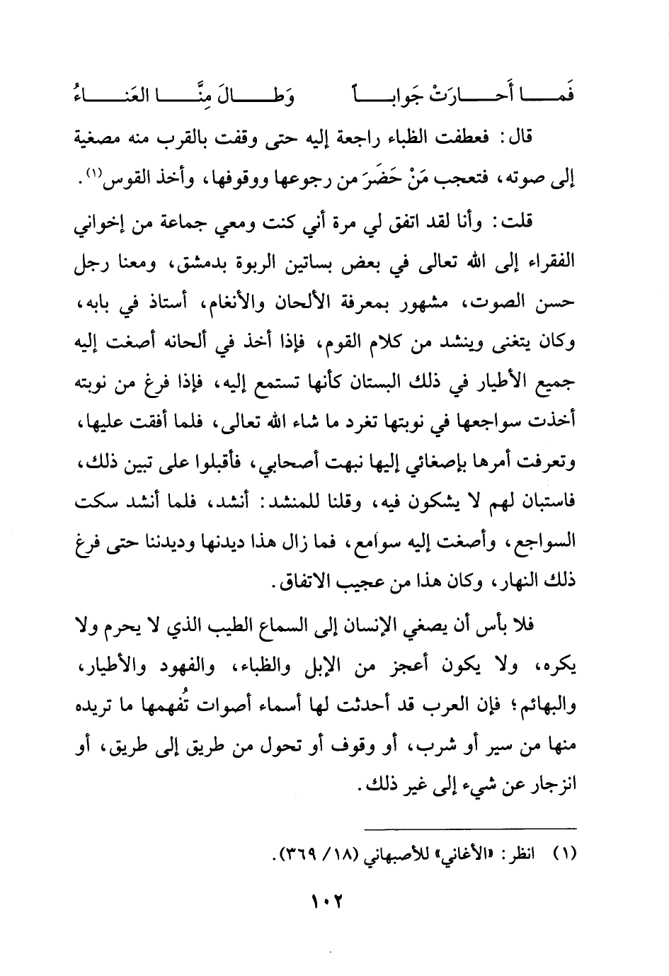قلت: وأنا لقد اتفق لي مرة أني كنت ومعي جماعة من إخواني الفقراء إلى الله تعالى في بعض بساتين الربوة بدمشق، ومعنا رجل حسن الصوت، مشهور بمعرفة الألحان والأنغام، أستاذ في بابه، وكان يتغنى وينشد من كلام القوم، فإذا أخذ في ألحانه أصغت إليه جميع الأطيار في ذلك البستان كأنها تستمع إليه، فإذا فرغ من نوبته أخذت سواجعها في نوبتها تغرد ما شاء الله تعالى، فلما أفقت عليها، وتعرفت أمرها بإصغائي إليها نبهت أصحابي، فاقبلوا على تبين ذلك، فاستبان لهم لا يشكون فيه، وقلنا للمنشد: أنشد، فلما أنشد سكت السواجع، وأصغت إليه سوامع، فما زال هذا ديدنها وديدننا حتى فرغ ذلك النهار، وكان هذا من عجيب الاتفاق.