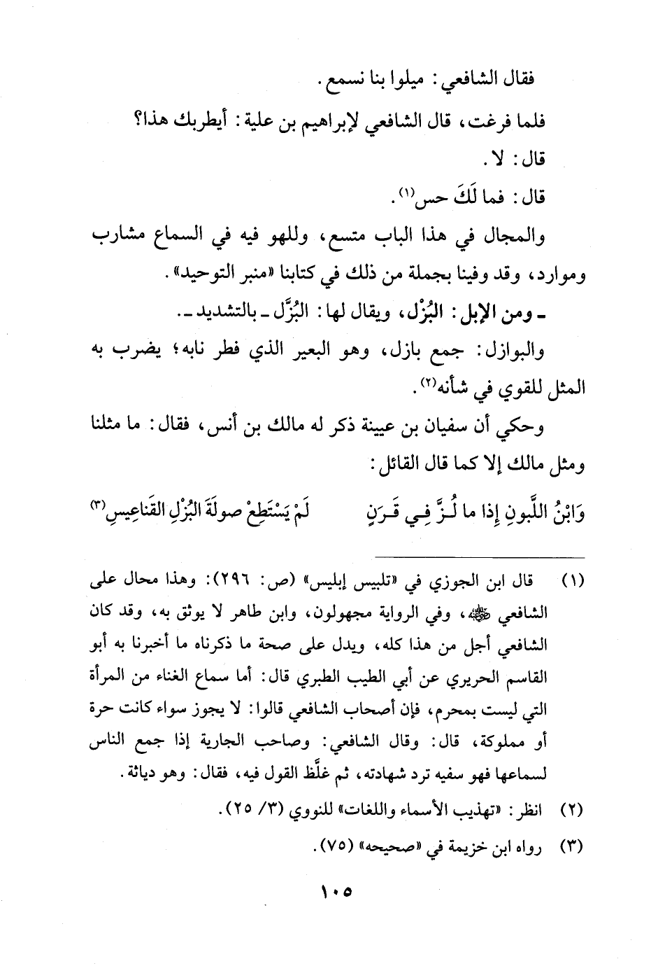 (¬1) قال ابن الجوزي في "تلبيس إبليس" (ص: 296): وهذا محال على الشافعي - رضي الله عنه -، وفي الرواية مجهولون، وابن طاهر لا يوثق به، وقد كان الشافعي أجل من هذا كله، ويدل على صحة ما ذكرناه ما أخبرنا به أبو القاسم الحريري عن أبي الطيب الطبري قال: أما سماع الغناء من المرأة التي ليست بمحرم، فإن أصحاب الشافعي قالوا: لا يجوز سواء كانت حرة أو مملوكة، قال: وقال الشافعي: وصاحب الجارية إذا جمع الناس لسماعها فهو سفيه ترد شهادته، ثم غلَّظ القول فيه، فقال: وهو دياثة.
