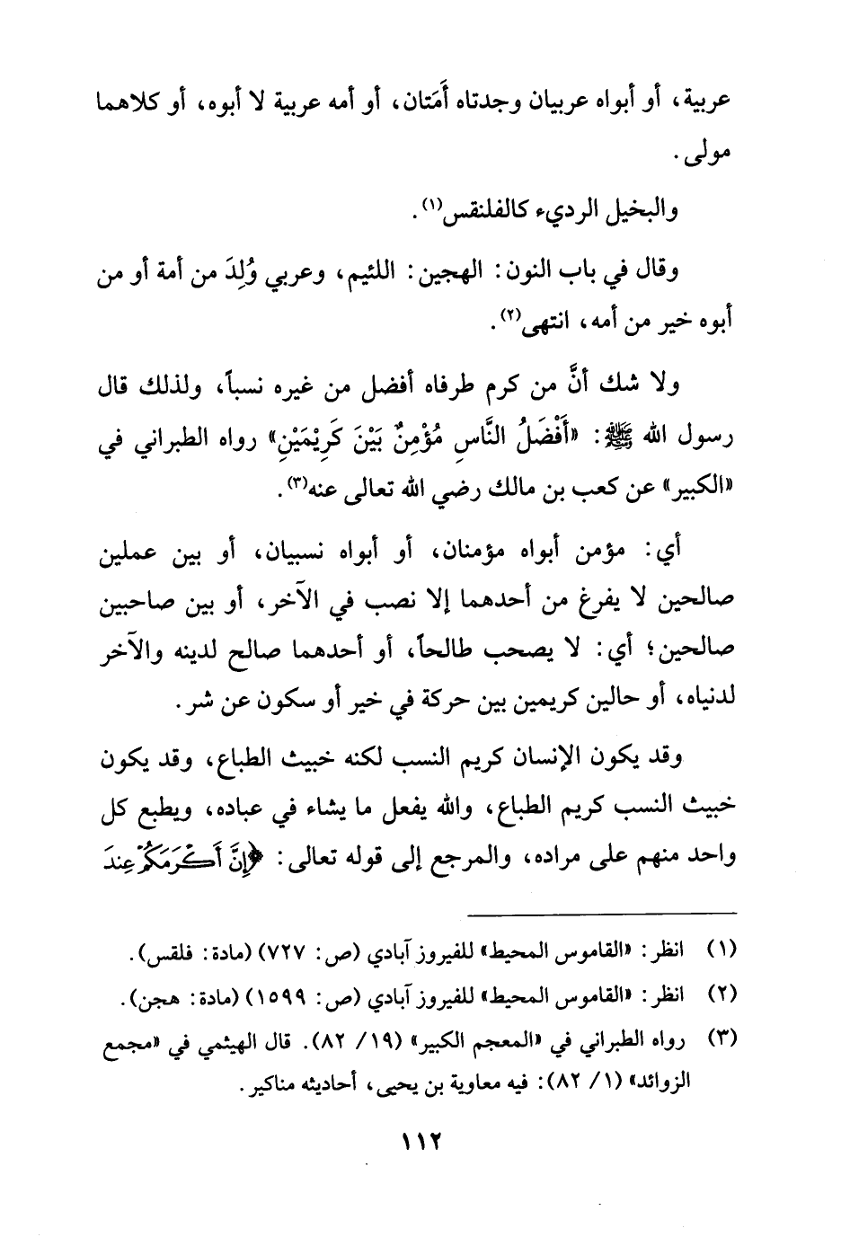 ولا شك أنَّ من كرم طرفاه أفضل من غيره نسباً، ولذلك قال رسول الله - صلى الله عليه وسلم -: "أَفْضَلُ النَّاسِ مُؤْمِنٌ بَيْنَ كَرِيْمَيْنِ" رواه الطبراني في "الكبير" عن كعب بن مالك رضي الله تعالى عنه (¬3).