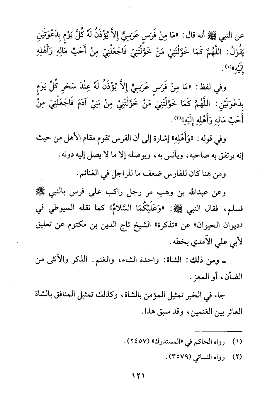 وفي لفظ: "مَا مِنْ فَرَسٍ عَرَبِىٍّ إِلاَّ يُؤْذَنُ لَهُ عِنْدَ سَحَرِ كُلِّ يَوْمٍ بِدَعْوَتَيْنِ: اللَّهُمَّ كَمَا خَوَّلْتَنِيْ مَنْ خَوَّلْتَنِيْ مِنْ بَنِيْ آدَمَ فَاجْعَلْنِيْ مِنْ أَحَبّ مَالِهِ وَأَهْلِهِ إِلَيْهِ" (¬2).