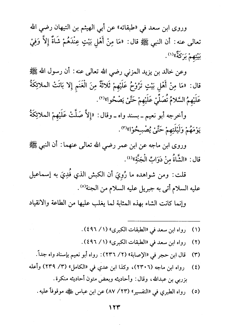 وروى ابن ماجه عن ابن عمر رضي الله تعالى عنهما: أن النبي - صلى الله عليه وسلم - قال: "الشَّاةُ مِنْ دَوَابِّ الْجَنَّةِ" (¬4).