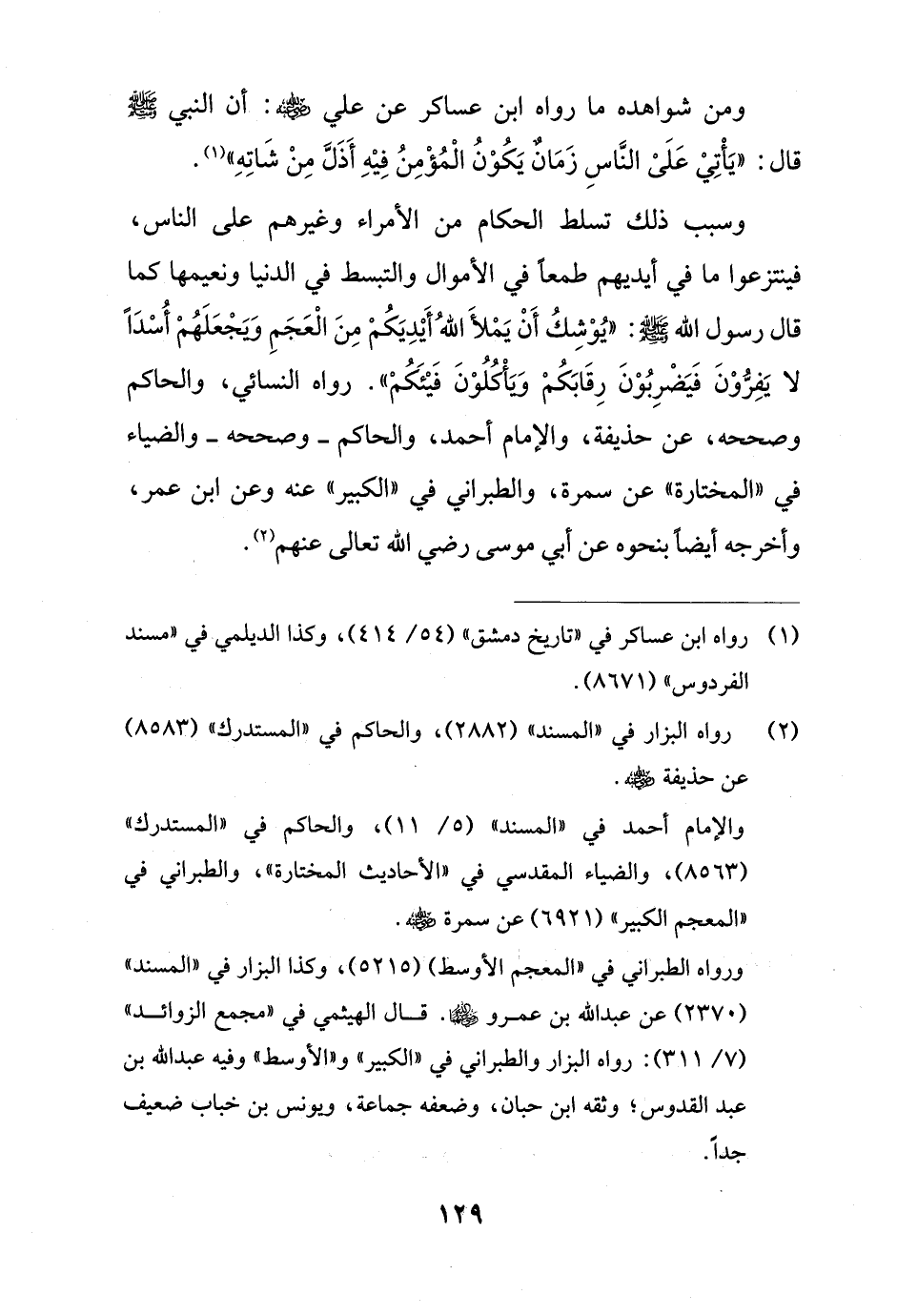 ومن شواهده ما رواه ابن عساكر عن علي -رضي الله عنه-: أن النبي - صلى الله عليه وسلم - قال: "يَأْتِيْ عَلَىْ النَّاسِ زَمَانٌ يَكُوْنُ الْمُؤْمِنُ فِيْهِ أَذَلَّ مِنْ شَاتِهِ" (¬1).