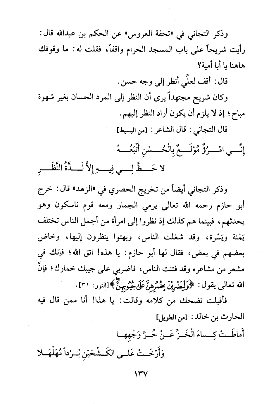 وذكر التجاني أيضاً من تخريج الحصري في "الزهد" قال: خرج أبو حازم رحمه الله تعالى يرمي الجمار ومعه قوم ناسكون وهو يحدثهم، فبينما هم كذلك إذ نظروا إلى امرأة من أجمل الناس تختلف يَمْنة وَيسْرة، وقد شغلت الناس، وبهتوا ينظرون إليها، وخاض بعضهم في بعض، فقال لها أبو حازم: يا هذه! اتق الله؛ فإنك في مشعر من مشاعره وقد فتنت الناس، فاضربي على جيبك خمارك؛ فإنَّ الله تعالى يقول: {وَلْيَضْرِبْنَ بِخُمُرِهِنَّ عَلَى جُيُوبِهِنَّ} [النور: 31].