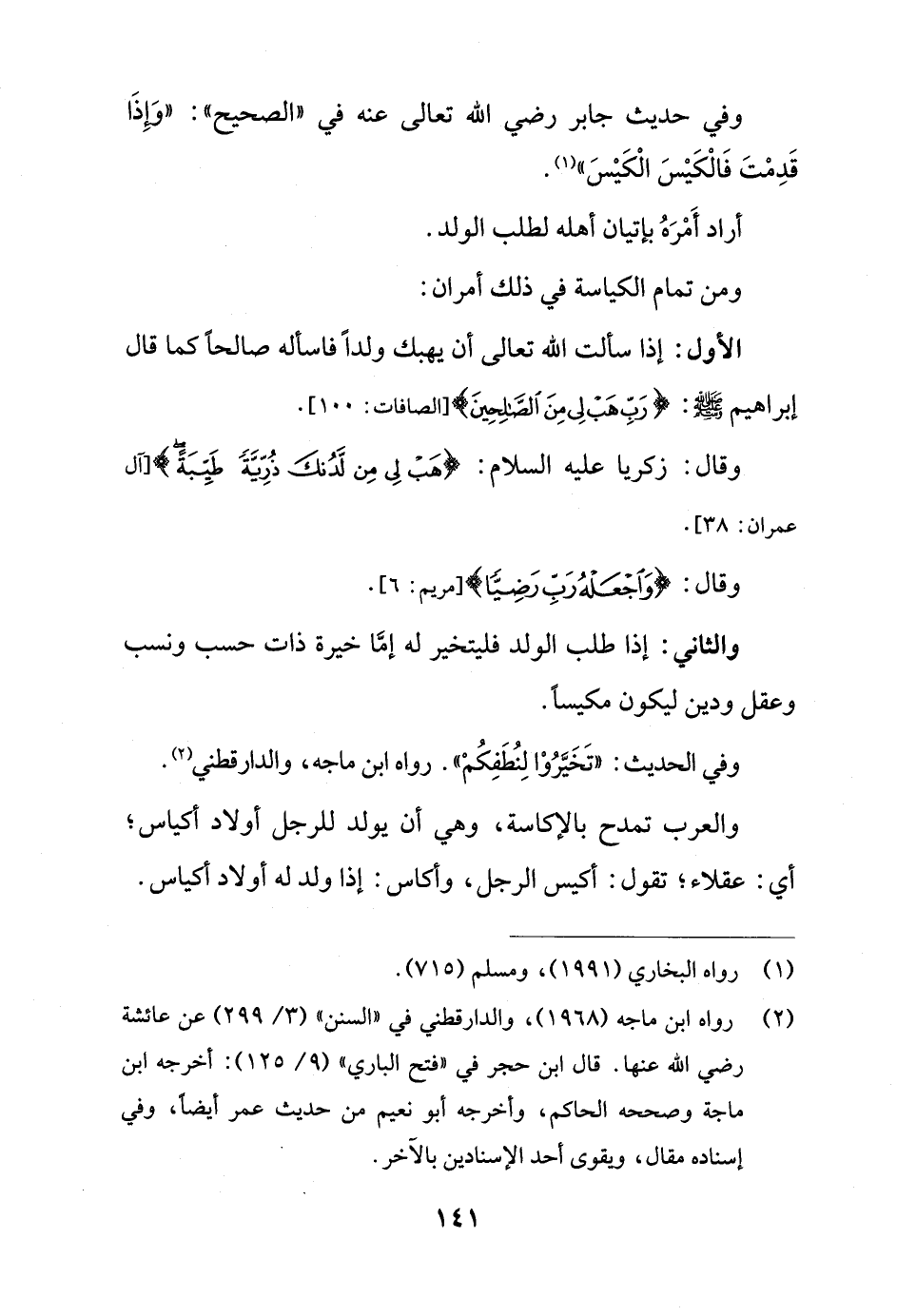 الأول: إذا سألت الله تعالى أن يهبك ولداً فاسأله صالحاً كما قال إبراهيم - صلى الله عليه وسلم -: {رَبِّ هَبْ لِي مِنَ الصَّالِحِينَ} [الصافات: 100].