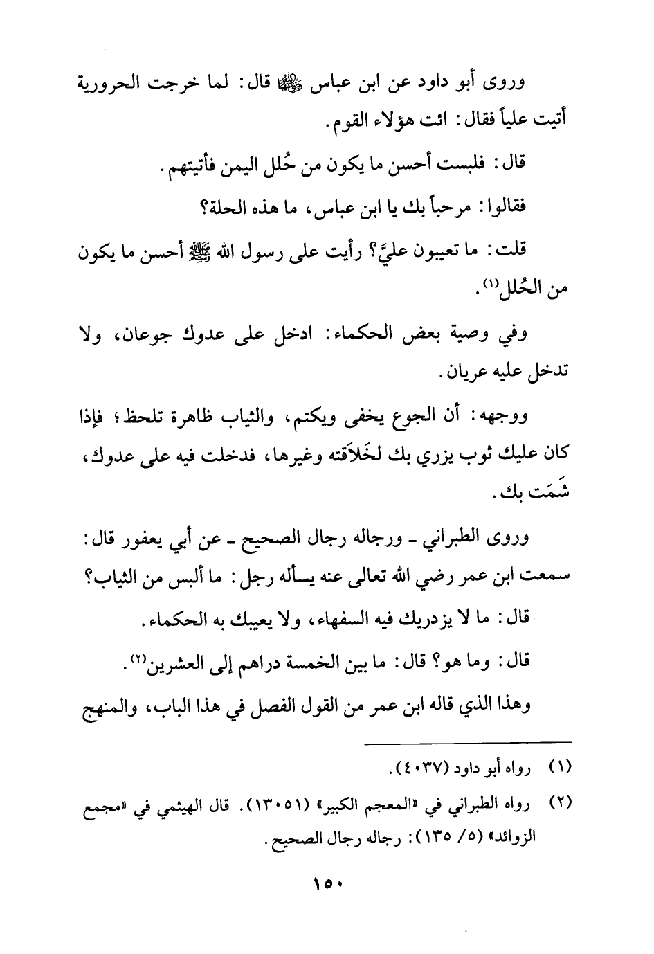 وروى الطبراني - ورجاله رجال الصحيح - عن أبي يعفور قال: سمعت ابن عمر رضي الله تعالى عنه يسأله رجل: ما ألبس من الثياب؟