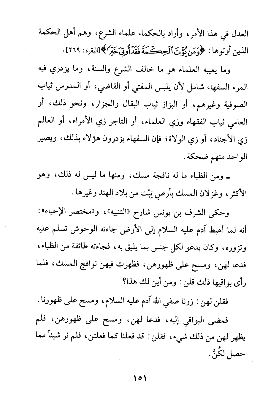 وحكى الشرف بن يونس شارح "التنبيه"، و"مختصر الإحياء": أنه لما أهبط آدم عليه السلام إلى الأرض جاءته الوحوش تسلم عليه وتزوره، وكان يدعو لكل جنس بما يليق به، فجاءته طائفة من الظباء، فدعا لهن، ومسح على ظهورهن، فظهرت فيهن نوافج المسك، فلما رأى بواقيها ذلك قلن: ومن أين لك هذا؟