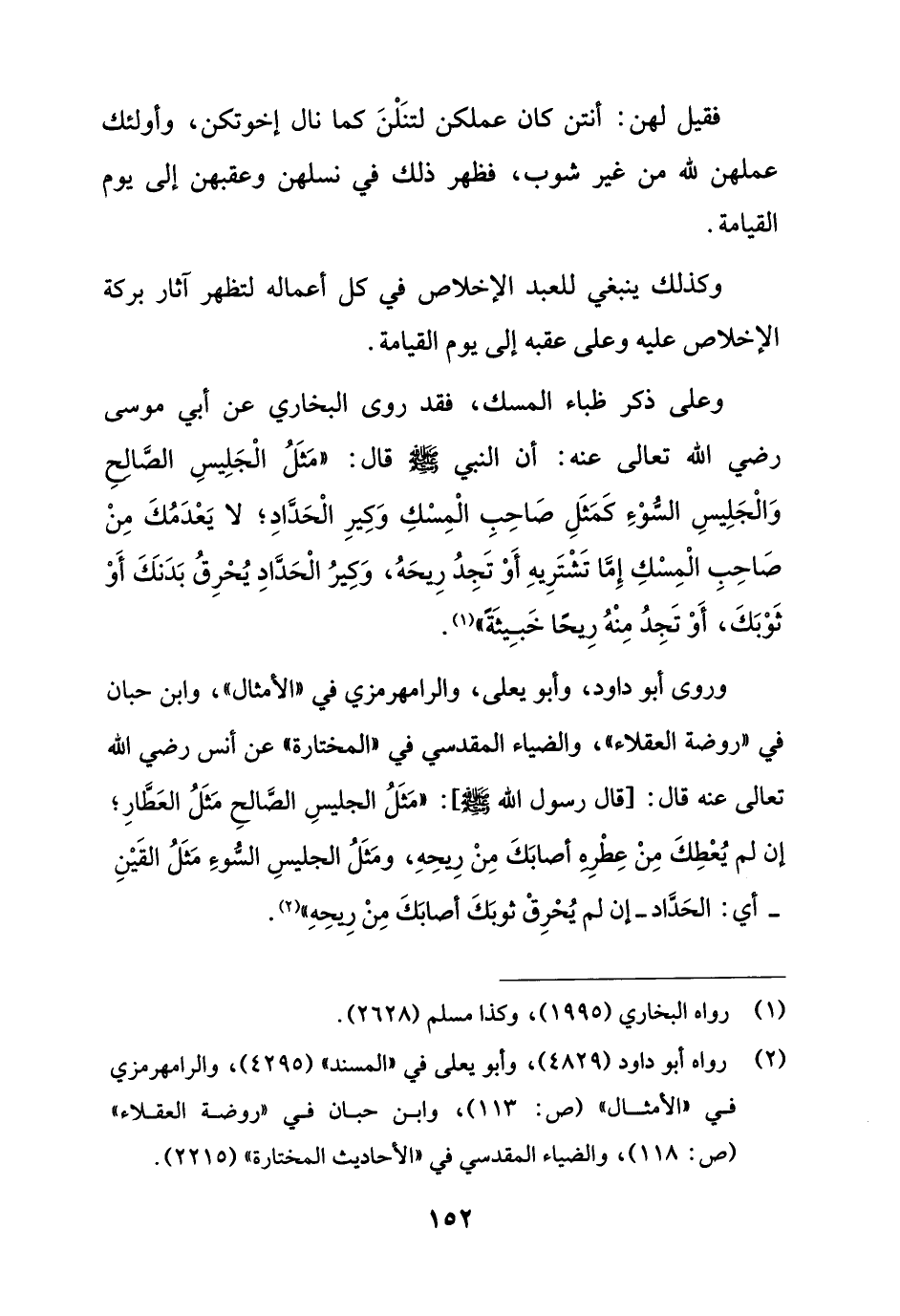 وروى أبو داود، وأبو يعلى، والرامهرمزي في "الأمثال"، وابن حبان في "روضة العقلاء"، والضياء المقدسي في "المختارة" عن أنس رضي الله تعالى عنه قال: [قال رسول الله - صلى الله عليه وسلم -]: "مَثَلُ الجليسِ الصَّالحِ مَثَلُ العَطَّار؛ إن لم يُعْطِكَ مِنْ عِطْرِهِ أصابَكَ مِنْ رِيحِهِ، ومَثَلُ الجليسِ السُّوءِ مَثَلُ القَيْنِ - أي: الحدَّاد - إن لم يُحْرِقْ ثوبَكَ أصابَكَ مِنْ رِيحِهِ" (¬2).