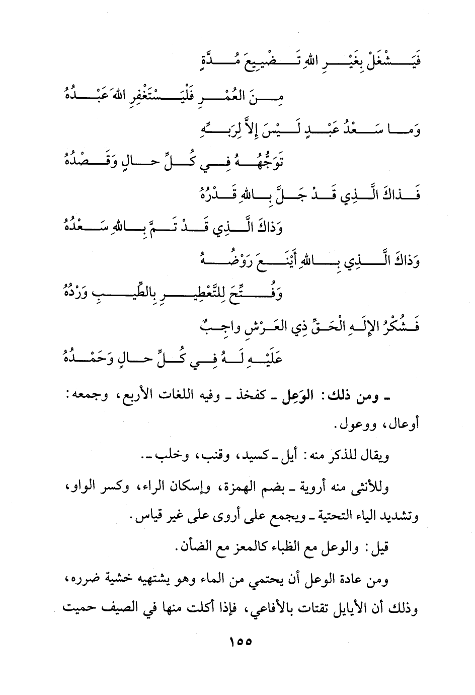 - ومن ذلك: الوَعِل -كفخذ- وفيه اللغات الأربع، وجمعه: أو عال، ووعول.