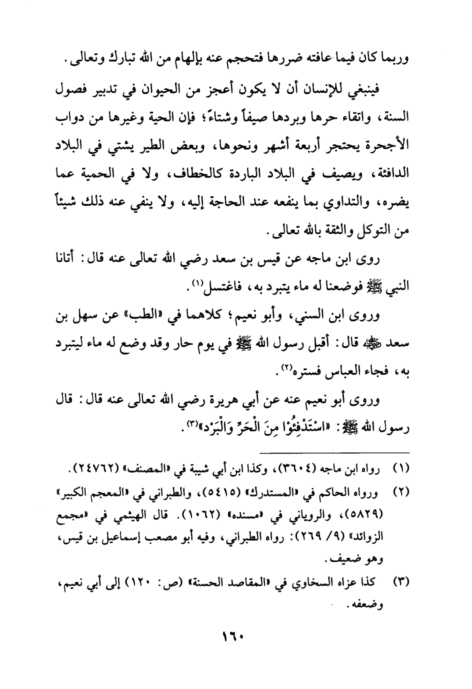 فينبغي للإنسان أن لا يكون أعجز من الحيوان في تدبير فصول السنة، واتقاء حرها وبردها صيفاً وشتاءً؛ فإن الحية وغيرها من دواب الأجحرة يحتجر أربعة أشهر ونحوها، وبعض الطير يشتي في البلاد الدافئة، ويصيف في البلاد الباردة كالخطاف، ولا في الحمية عما يضره، والتداوي بما ينفعه عند الحاجة إليه، ولا ينفي عنه ذلك شيئاً من التوكل والثقة بالله تعالى.