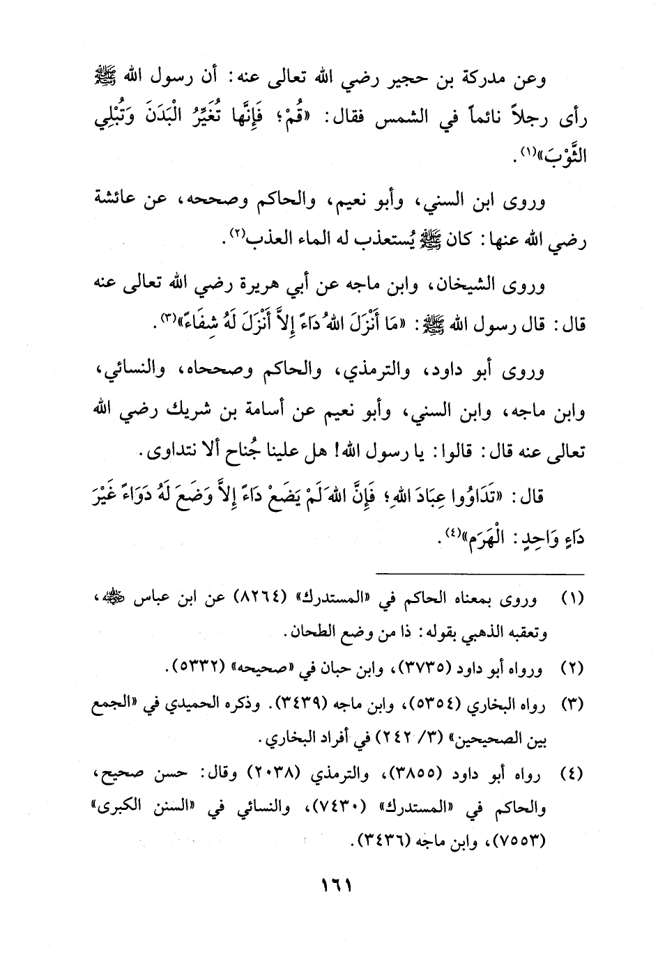 وروى أبو داود، والترمذي، والحاكم وصححاه، والنسائي، وابن ماجه، وابن السني، وأبو نعيم عن أسامة بن شريك رضي الله تعالى عنه قال: قالوا: يا رسول الله! هل علينا جُناح ألا نتداوى.