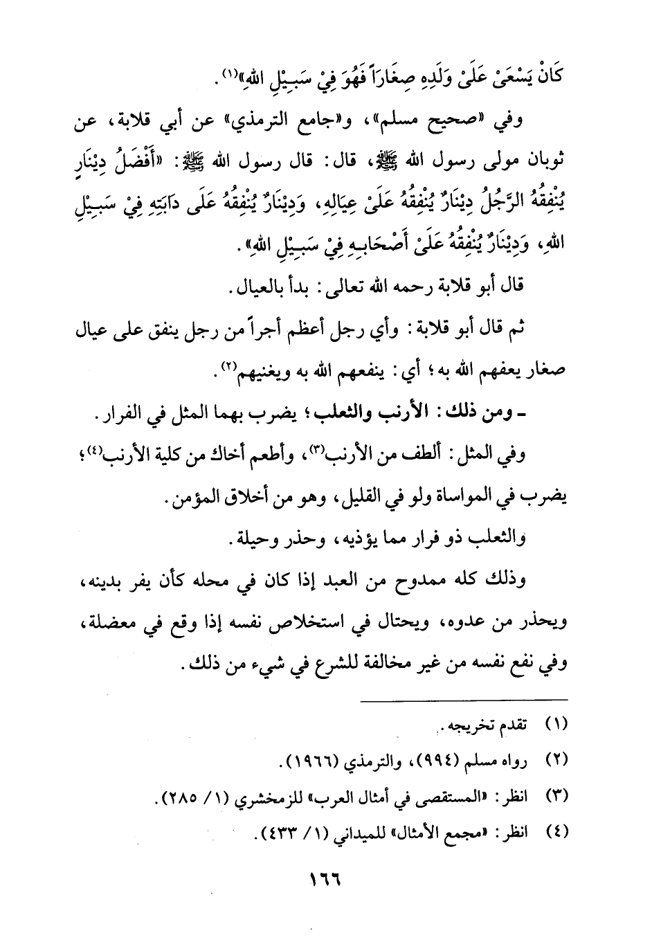 وفي "صحيح مسلم"، و"جامع الترمذي" عن أبي قلابة، عن ثوبان مولى رسول الله - صلى الله عليه وسلم -، قال: قال رسول الله - صلى الله عليه وسلم -: "أَفْضَلُ دِيْنَارِ يُنْفِقُهُ الرَّجُلُ دِيْنَارٌ يُنْفِقُهُ عَلَىْ عِيَالِهِ، وَدِيْنَارٌ يُنْفِقُهُ عَلَى دابَّتِهِ فِيْ سَبِيْلِ اللهِ، وَدِيْنَارٌ يُنْفِقُهُ عَلَىْ أَصْحَابِهِ فِيْ سَبِيْلِ اللهِ".