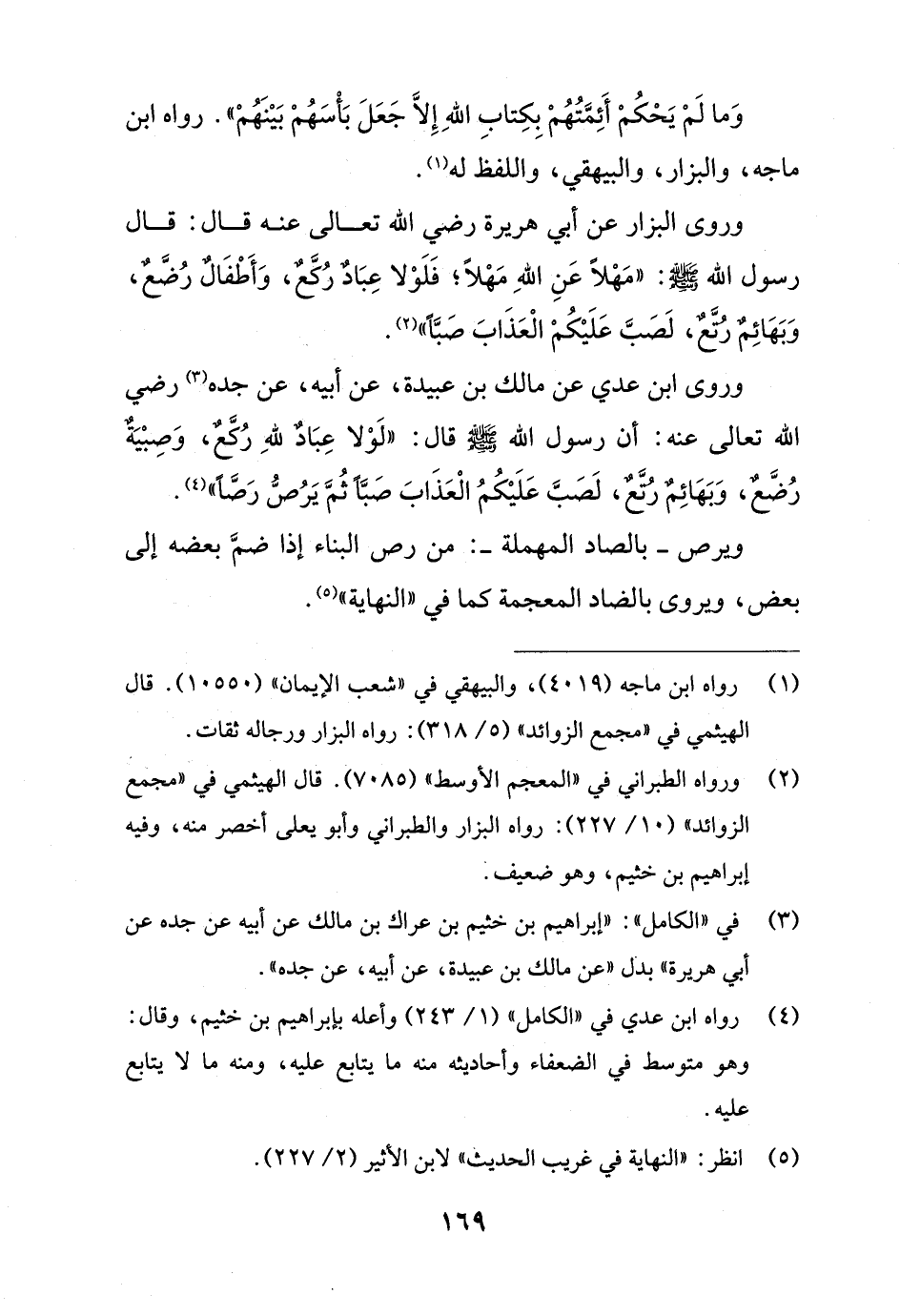 وروى البزار عن أبي هريرة رضي الله تعالى عنه قال: قال رسول الله - صلى الله عليه وسلم -: "مَهْلاً عَنِ اللهِ مَهْلاً؛ فَلَوْلا عِبَادٌ رُكَّعٌ، وَأَطْفَالٌ رُضَّعٌ، وَبَهَائِمٌ رُتَّعٌ، لصَبَّ عَلَيْكُمْ الْعَذَابَ صَبًّا" (¬2).