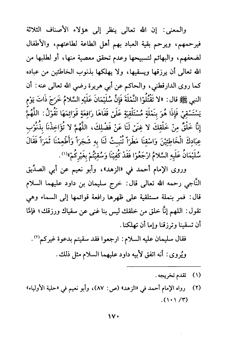 وروى الإمام أحمد في "الزهد"، وأبو نعيم عن أبي الصدِّيق النَّاجي رحمه الله تعالى قال: خرج سليمان بن داود عليهما السلام قال: فمر بنملة مستلقية على ظهرها رافعة قوائمها إلى السماء وهي تقول: اللهم إنَّا خلق من خلقك ليس بنا غنى عن سقياك ورزقك؛ فإمَّا أن تسقينا وترزقنا وإما أن تهلكنا.