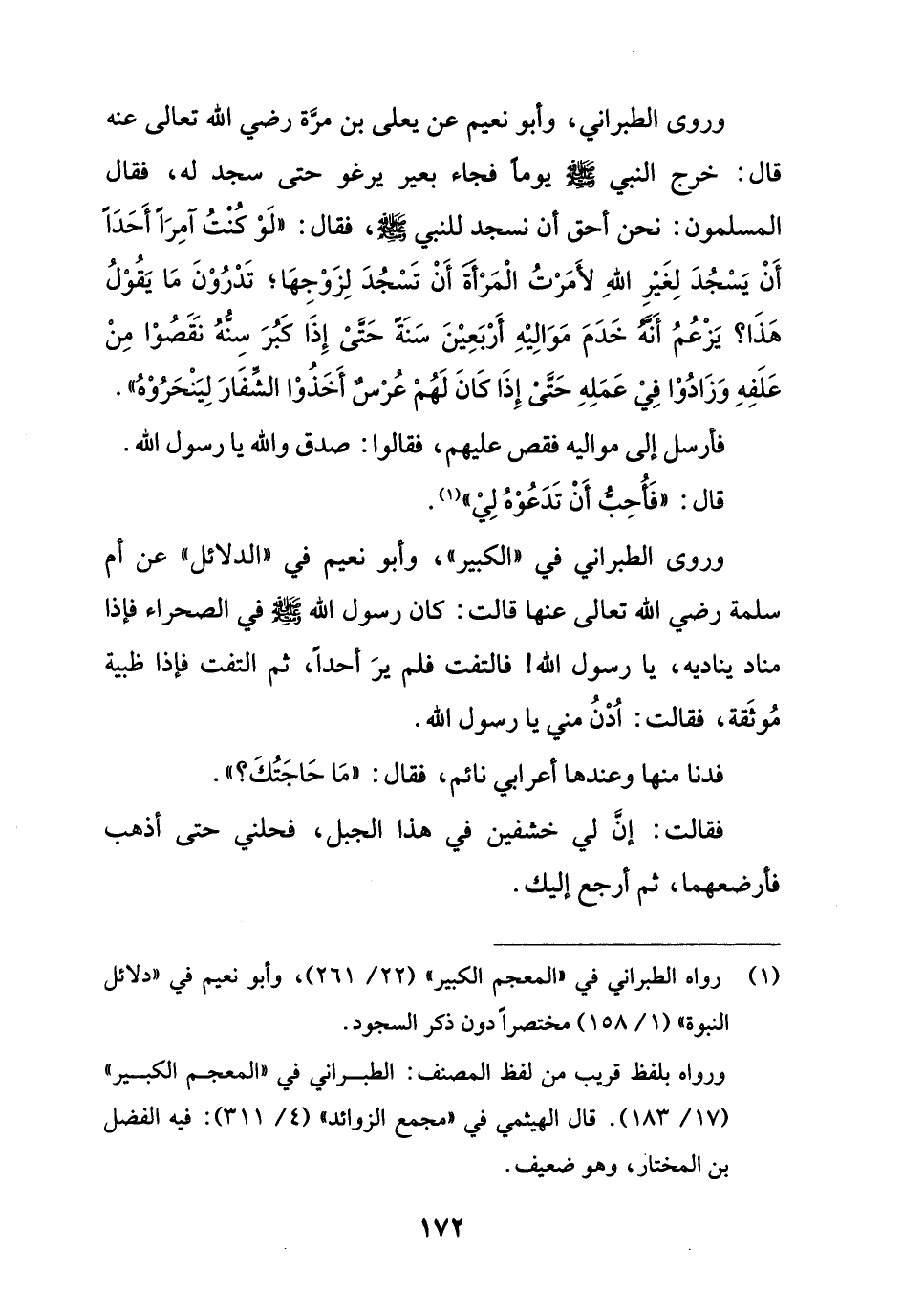 وروى الطبراني، وأبو نعيم عن يعلى بن مرَّة رضي الله تعالى عنه قال: خرج النبي - صلى الله عليه وسلم - يوما فجاء بعير يرغو حتى سجد له، فقال المسلمون: نحن أحق أن نسجد للنبي - صلى الله عليه وسلم -، فقال: "لَوْ كُنْتُ آمِرًا أَحَدًا أَنْ يَسْجُدَ لِغَيْرِ اللهِ لأَمَرْتُ الْمَرْأةَ أَنْ تَسْجُدَ لِزَوْجِهَا؛ تَدْرُوْنَ مَا يَقُوْلُ هَذَا؟ يَزْعُمُ أَنَّهُ خَدَمَ مَوَالِيْهِ أَرْبَعِيْنَ سَنَةً حَتَّى إِذَا كَبُرَ سِنُّهُ نَقَصُوْا مِنْ عَلَفِهِ وَزَادُوْا فِيْ عَمَلِهِ حَتَّى إِذَا كَانَ لَهُمْ عُرسٌ أَخَذُوْا الشِّفَارَ لِيَنْحَرُوْهُ".