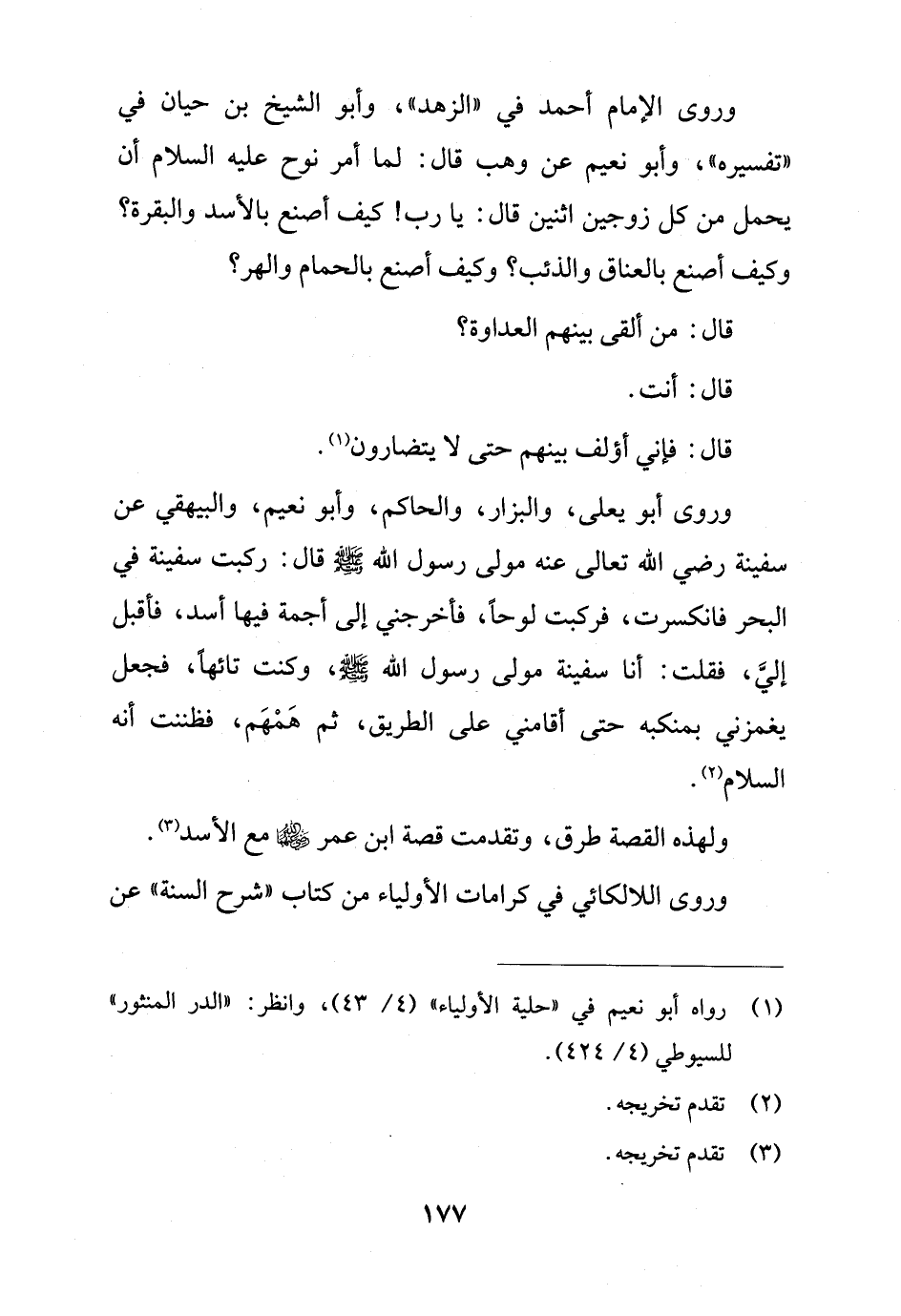 وروى أبو يعلى، والبزار، والحاكم، وأبو نعيم، والبيهقي عن سفينة رضي الله تعالى عنه مولى رسول الله - صلى الله عليه وسلم - قال: ركبت سفينة في البحر فانكسرت، فركبت لوحاً، فأخرجني إلى أجمة فيها أسد، فأقبل إليَّ، فقلت: أنا سفينة مولى رسول الله - صلى الله عليه وسلم -، وكنت تائهاً، فجعل يغمزني بمنكبه حتى أقامني على الطريق، ثم هَمْهَم، فظننت أنه السلام (¬2).