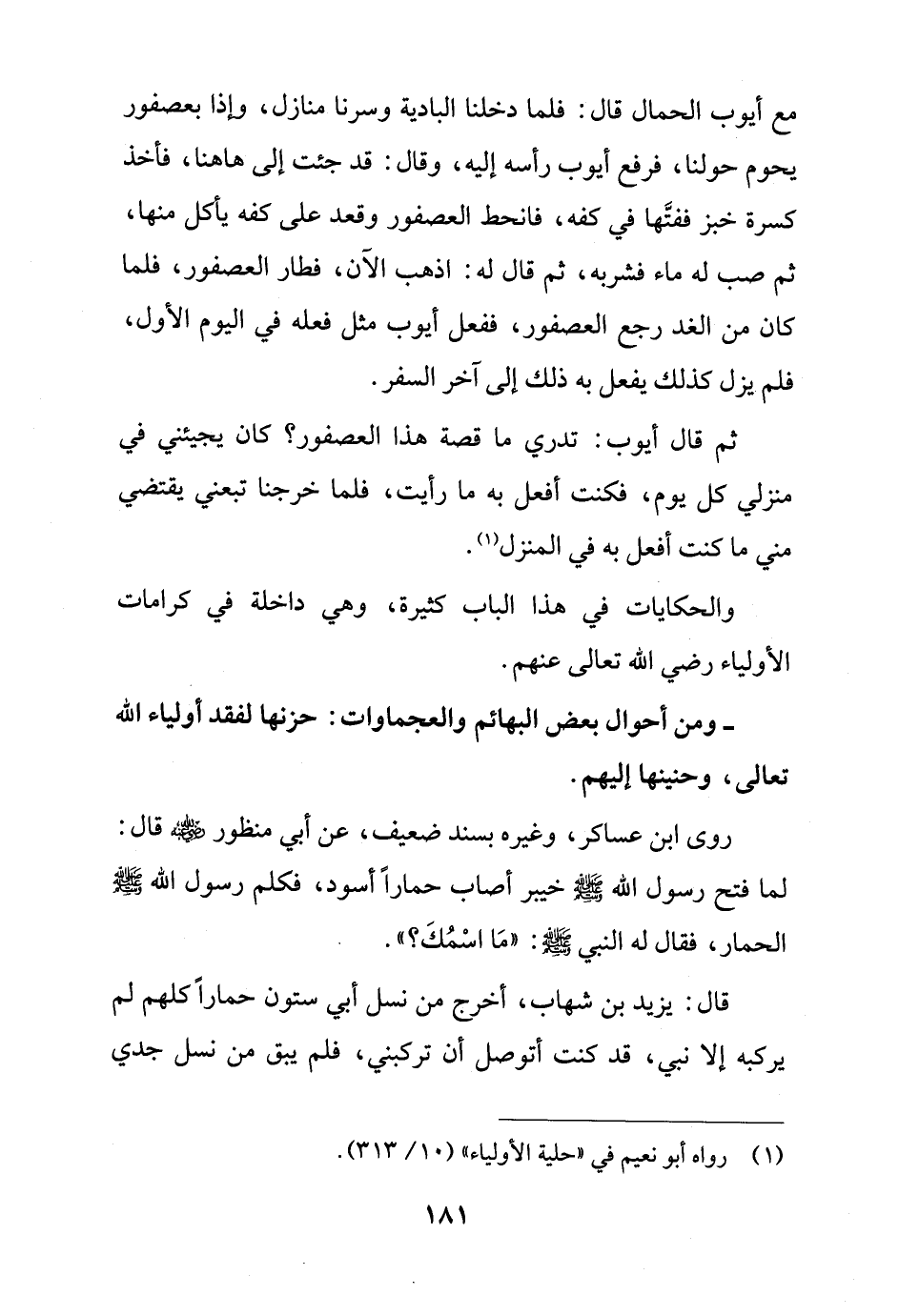 مع أيوب الحمال قال: فلما دخلنا البادية وسرنا منازل، وإذا بعصفور يحوم حولنا، فرفع أيوب رأسه إليه، وقال: قد جئت إلى هاهنا، فأخذ كسرة خبز ففتَّها في كفه، فانحط العصفور وقعد على كفه يأكل منها، ثم صب له ماء فشربه، ثم قال له: اذهب الآن، فطار العصفور، فلما كان من الغد رجع العصفور، ففعل أيوب مثل فعله في اليوم الأول، فلم يزل كذلك يفعل به ذلك إلى آخر السفر.